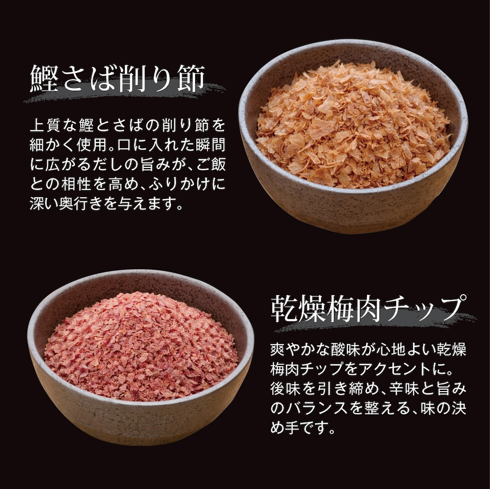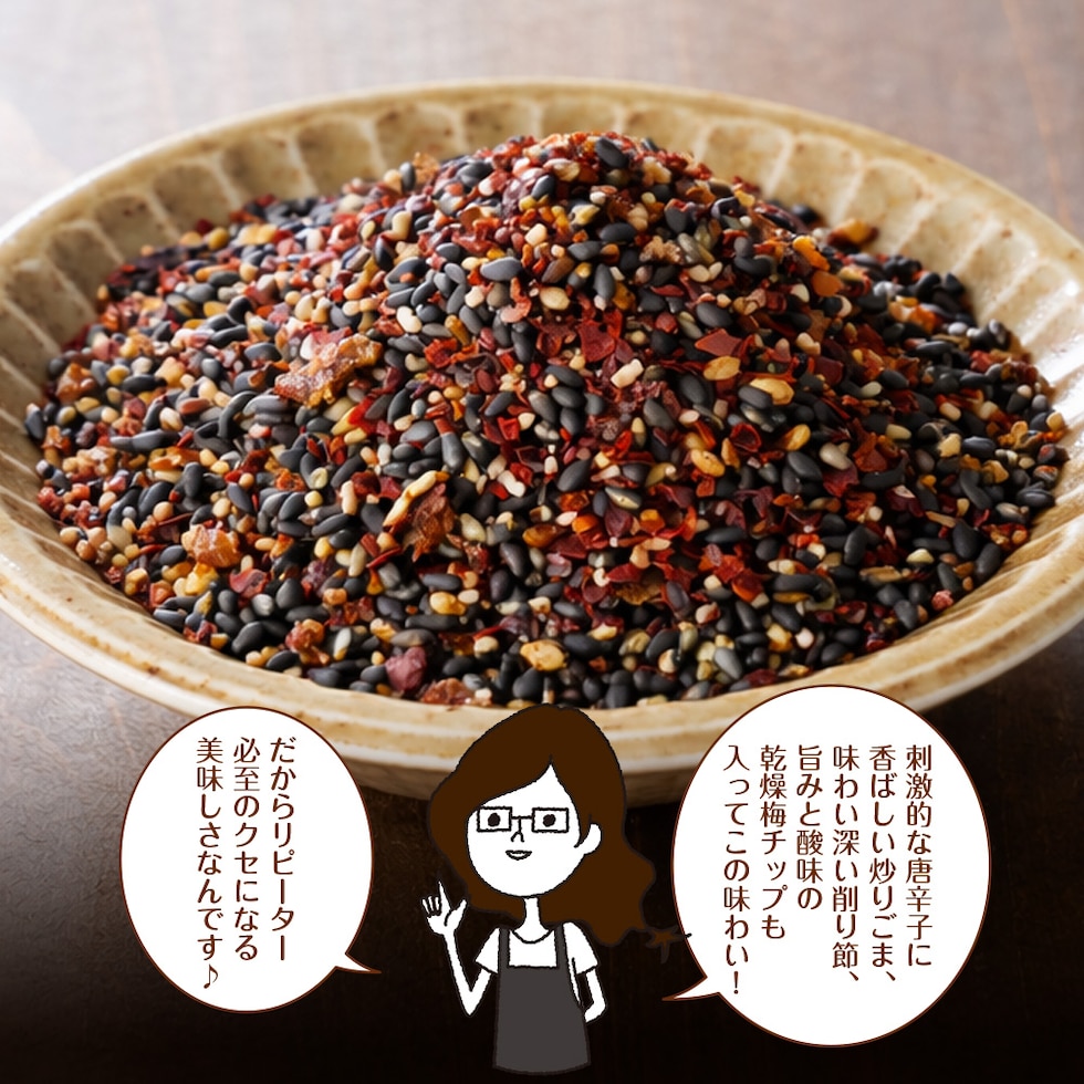 いりごま(国内製造)、唐辛子、調味顆粒(乳糖、食塩、ぶどう糖、その他)、ごま加工品(いりごま、ぶどう糖、食塩、その他)、味付け削り節(削り節(かつお、さば)、砂糖、いりごま、その他)、食塩、梅肉チップ、乾燥赤しそ、海苔/調味料(アミノ酸等)、着色料(クチナシ赤色素、クチナシ黄色素、アントシアニン)、酸味料、甘味料(ステビア)、香料、増粘剤(キサンタン)、(一部に小麦・乳成分・大豆・ごま・さばを含む)