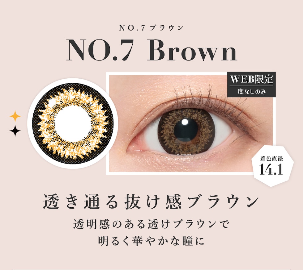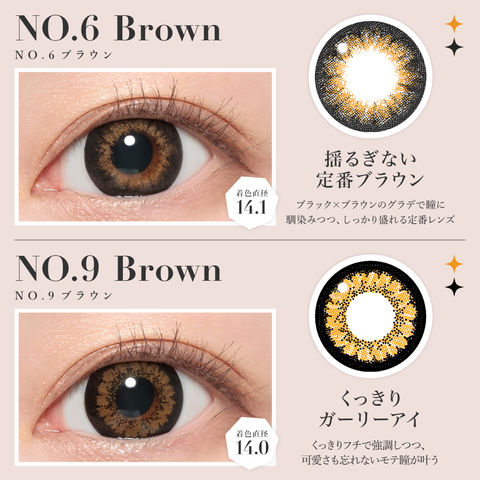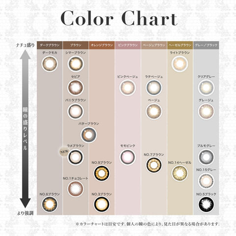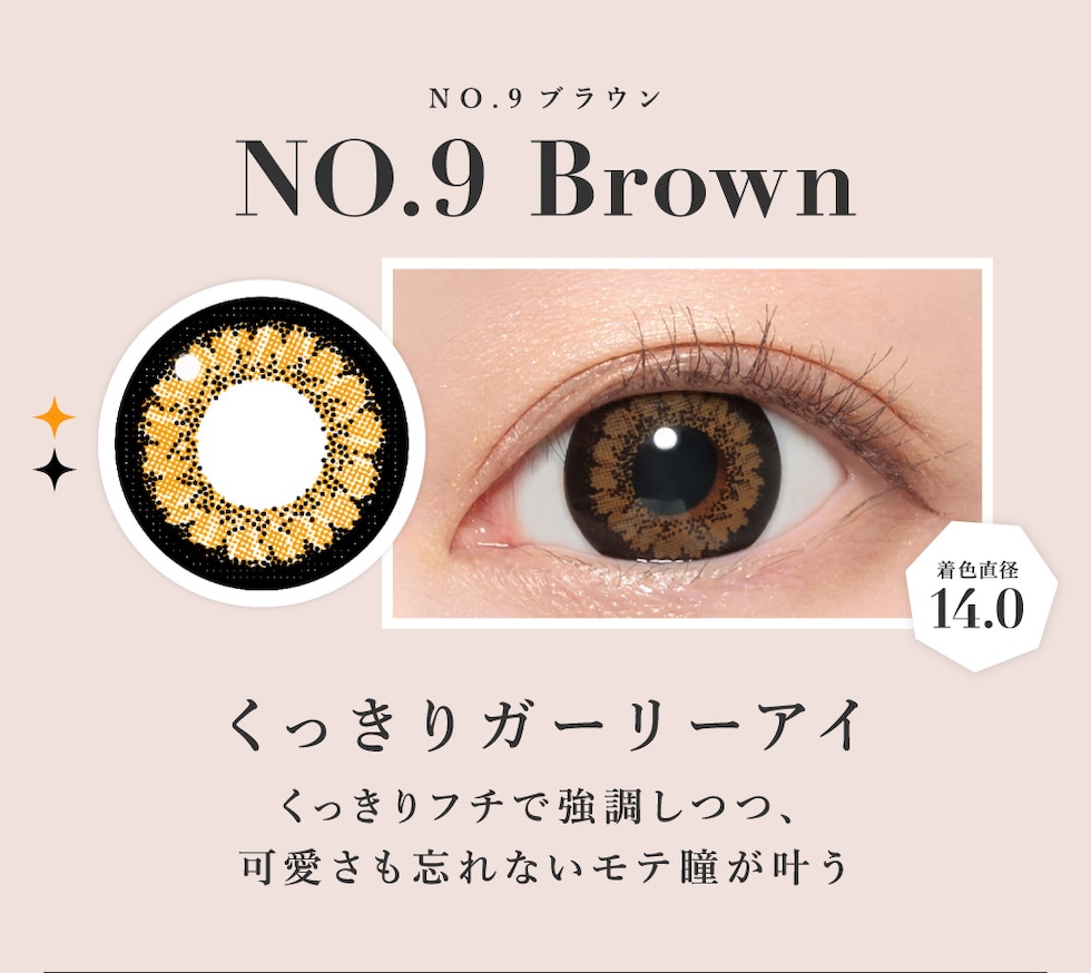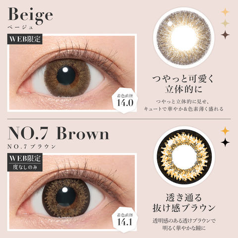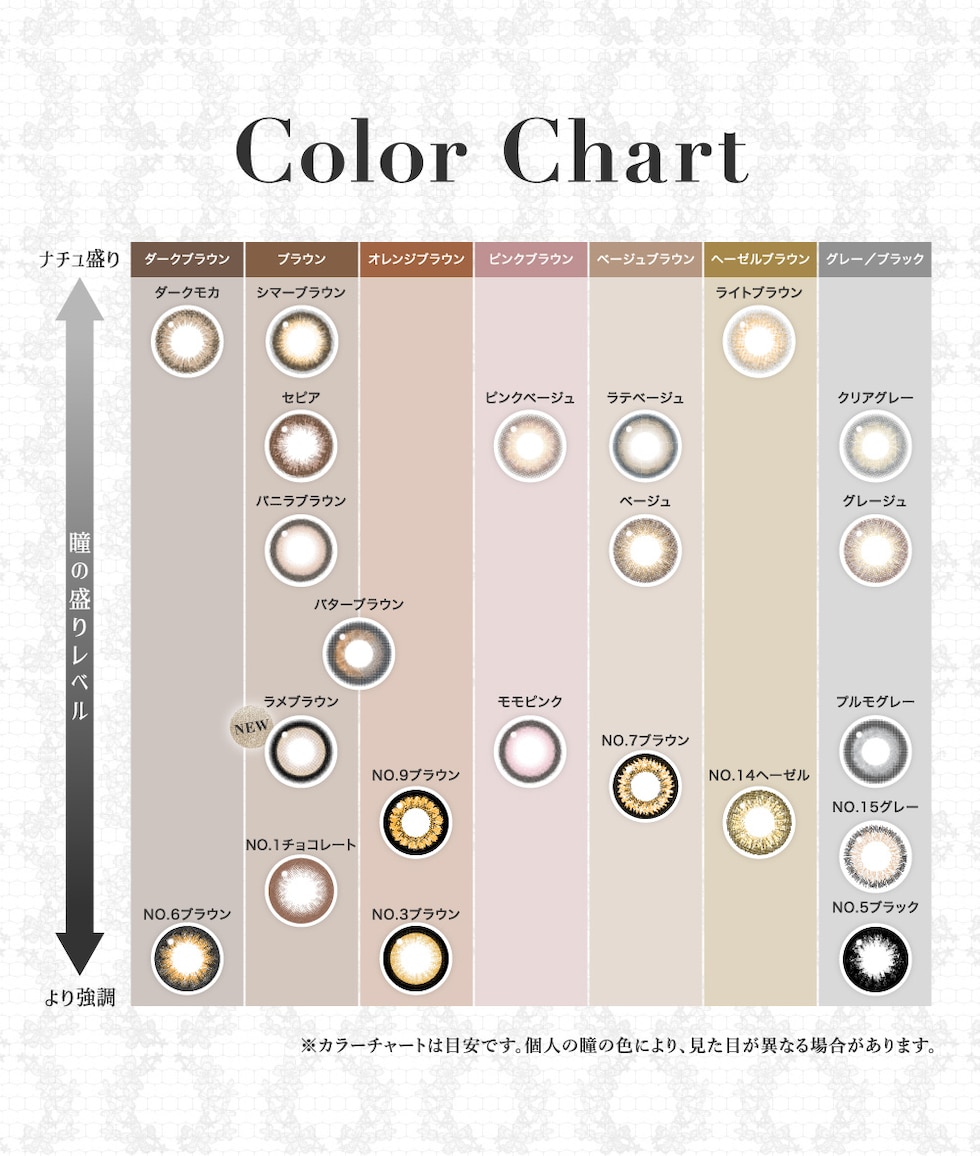 | 着色直径 | <13.8> バニラブラウン・モモピンク・ラテベージュ・ピンクベージュ・シマーブラウン・クリアグレー・ライトブラウン <13.9> セピア <14.0> ラメブラウン・バターブラウン・プルモグレー・グレージュ・ベージュ・NO.9ブラウン・NO.14ヘーゼル・NO.15グレー <14.1> ダークモカ・NO.1チョコレート・NO.3ブラウン・NO.5ブラック・NO.6ブラウン・NO.7ブラウン |