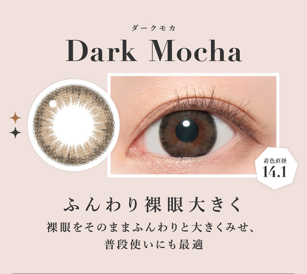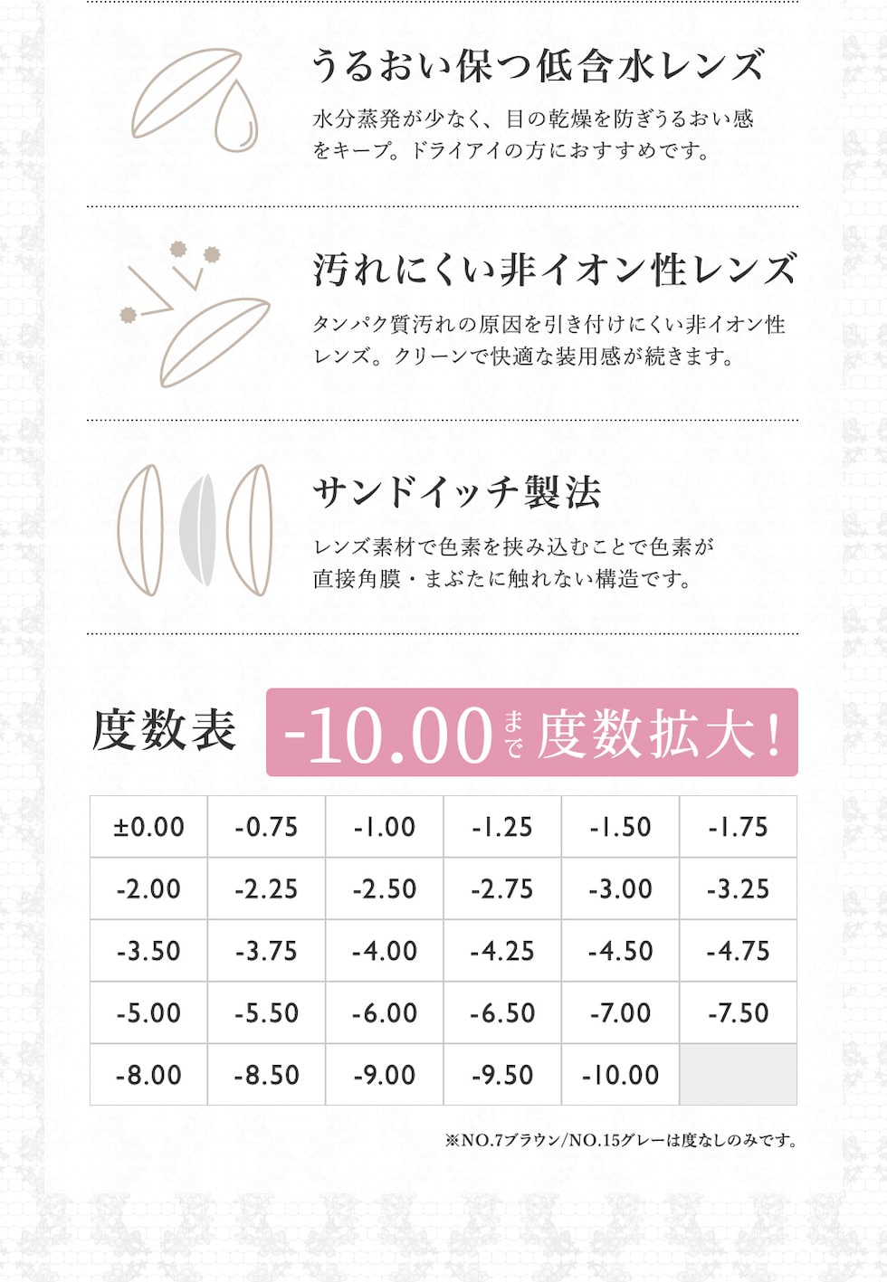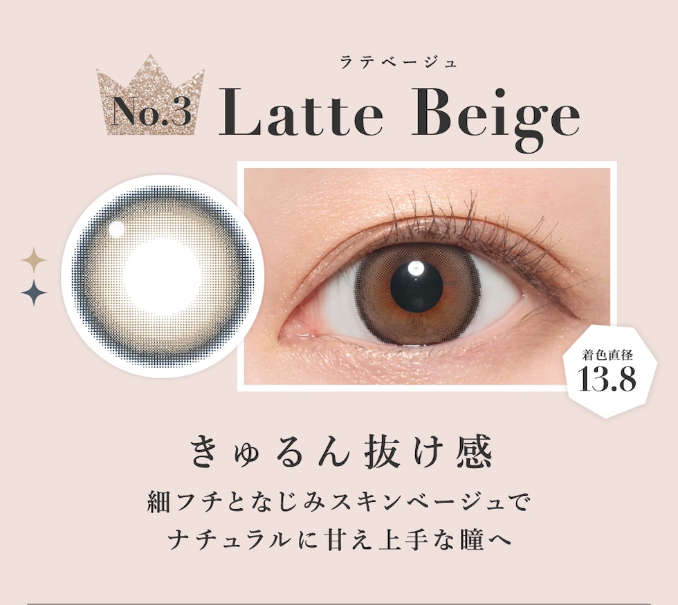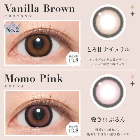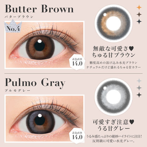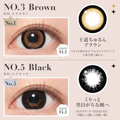 | 着色直径 | <13.8> バニラブラウン・モモピンク・ラテベージュ・ピンクベージュ・シマーブラウン・クリアグレー・ライトブラウン <13.9> セピア <14.0> ラメブラウン・バターブラウン・プルモグレー・グレージュ・ベージュ・NO.9ブラウン・NO.14ヘーゼル・NO.15グレー <14.1> ダークモカ・NO.1チョコレート・NO.3ブラウン・NO.5ブラック・NO.6ブラウン・NO.7ブラウン |