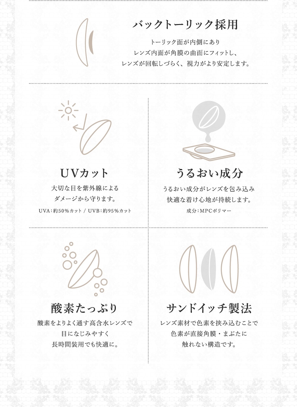 ・単回使用視力補正用色付コンタクトレンズ ・医療機器承認番号:22800BZI00037A41 ・高度管理医療機器販売業許可番号:第25N00097号 ※処方箋の取得をおすすめ致します。 |
