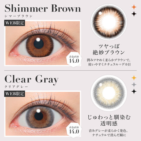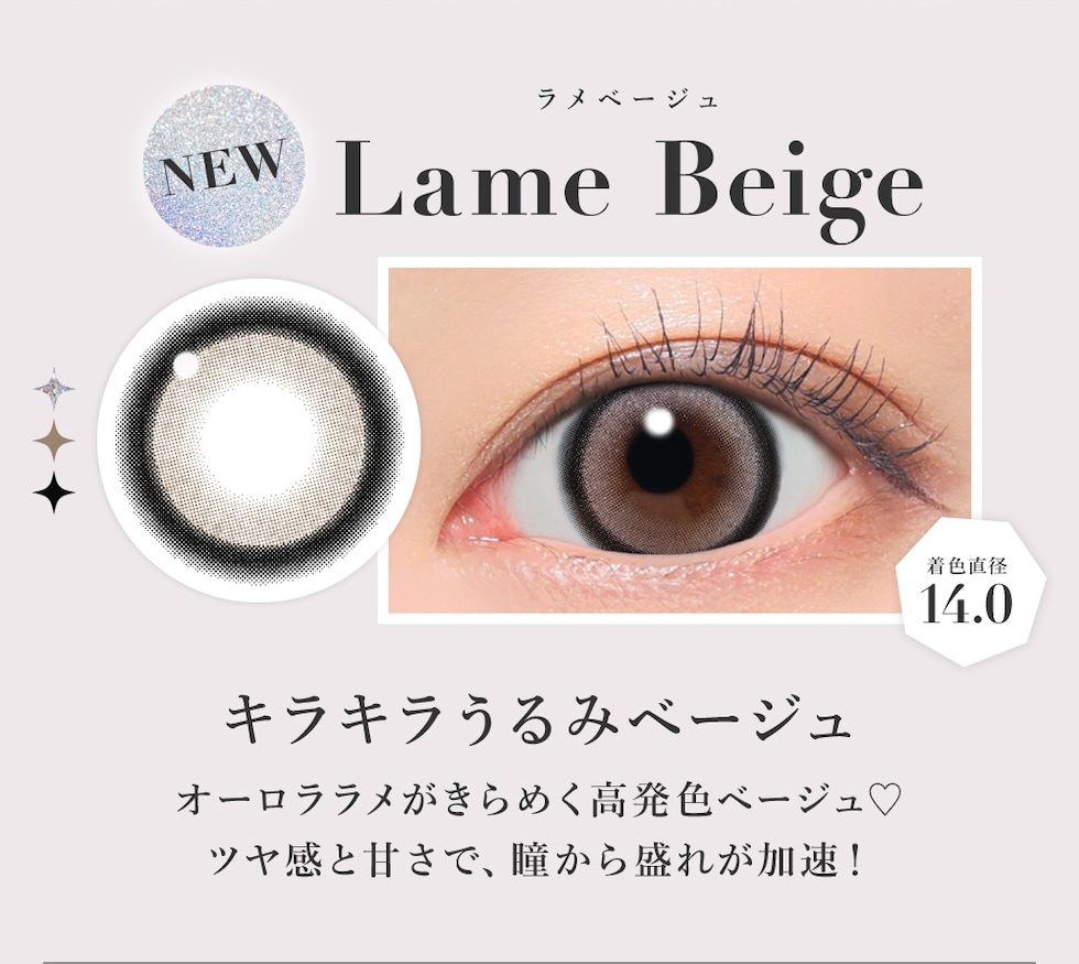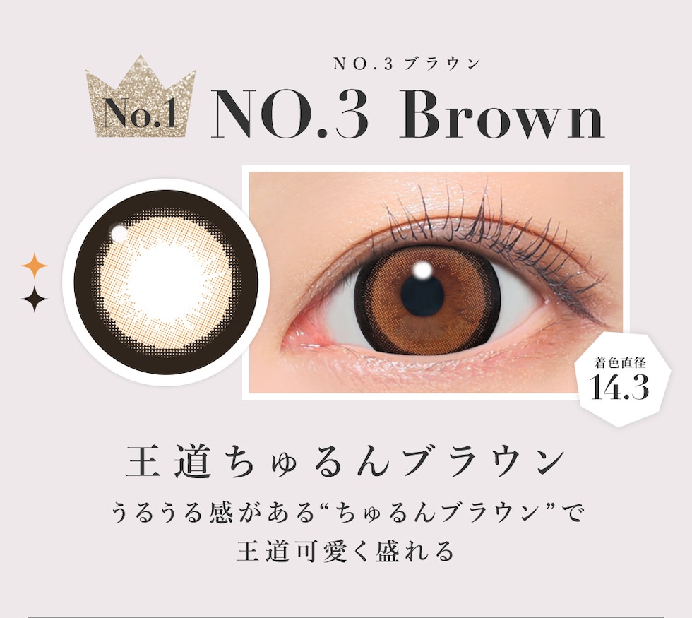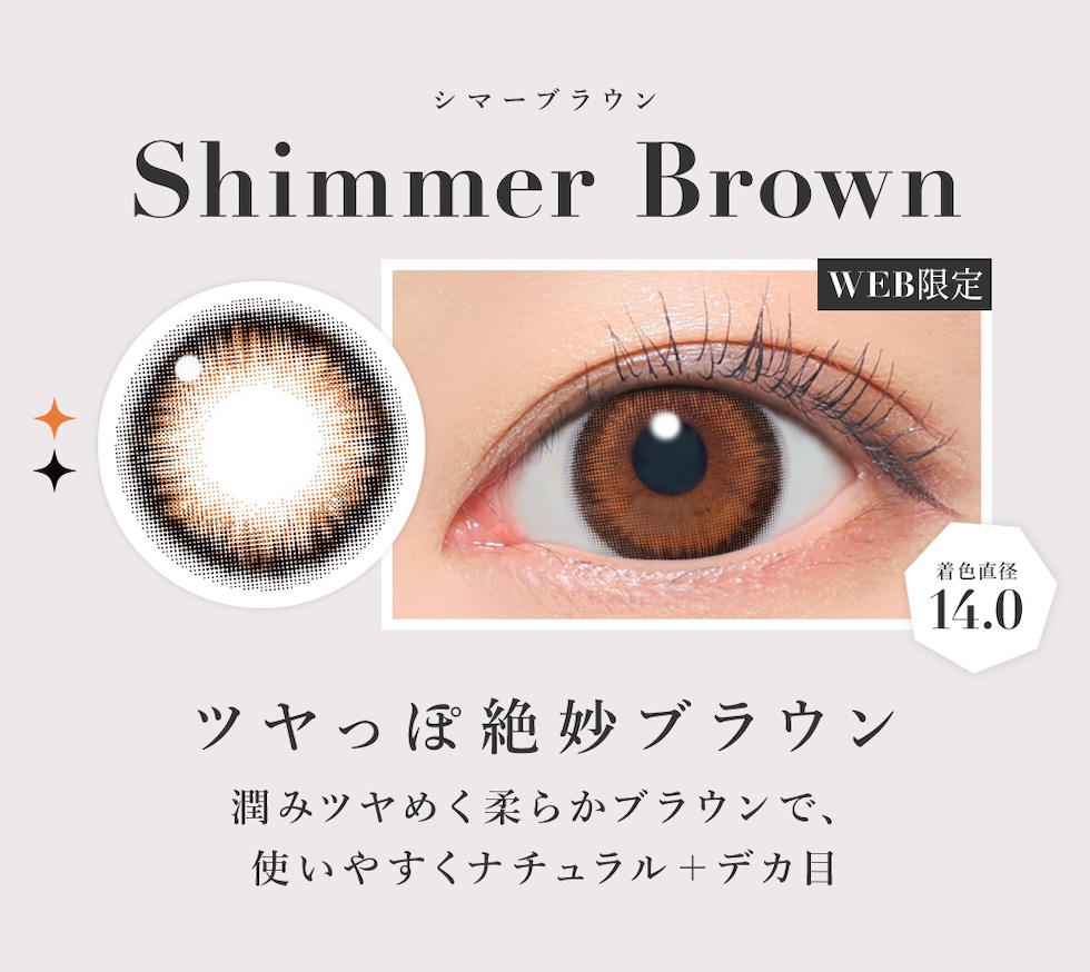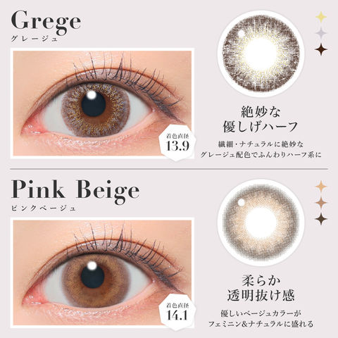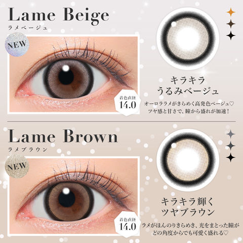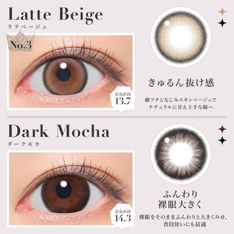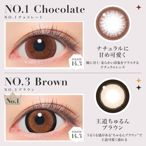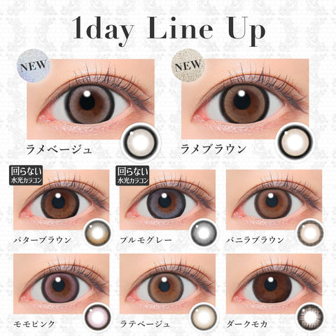 | BC(ベースカーブ) | -8.7mm- バターブラウン / プルモグレー -8.6mm- ラメベージュ / ラメブラウン / バニラブラウン / モモピンク / ラテベージュ / ダークモカ / グレージュ / ピンクベージュ / NO.1チョコレート / NO.3ブラウン / NO.5ブラック / NO.6ブラウン / NO.9ブラウン / NO.14ヘーゼル / クリアグレー / シマーブラウン |