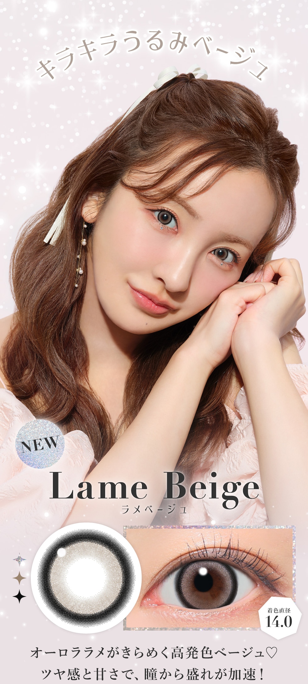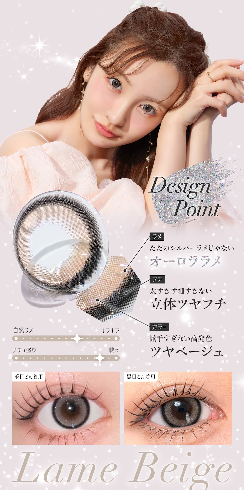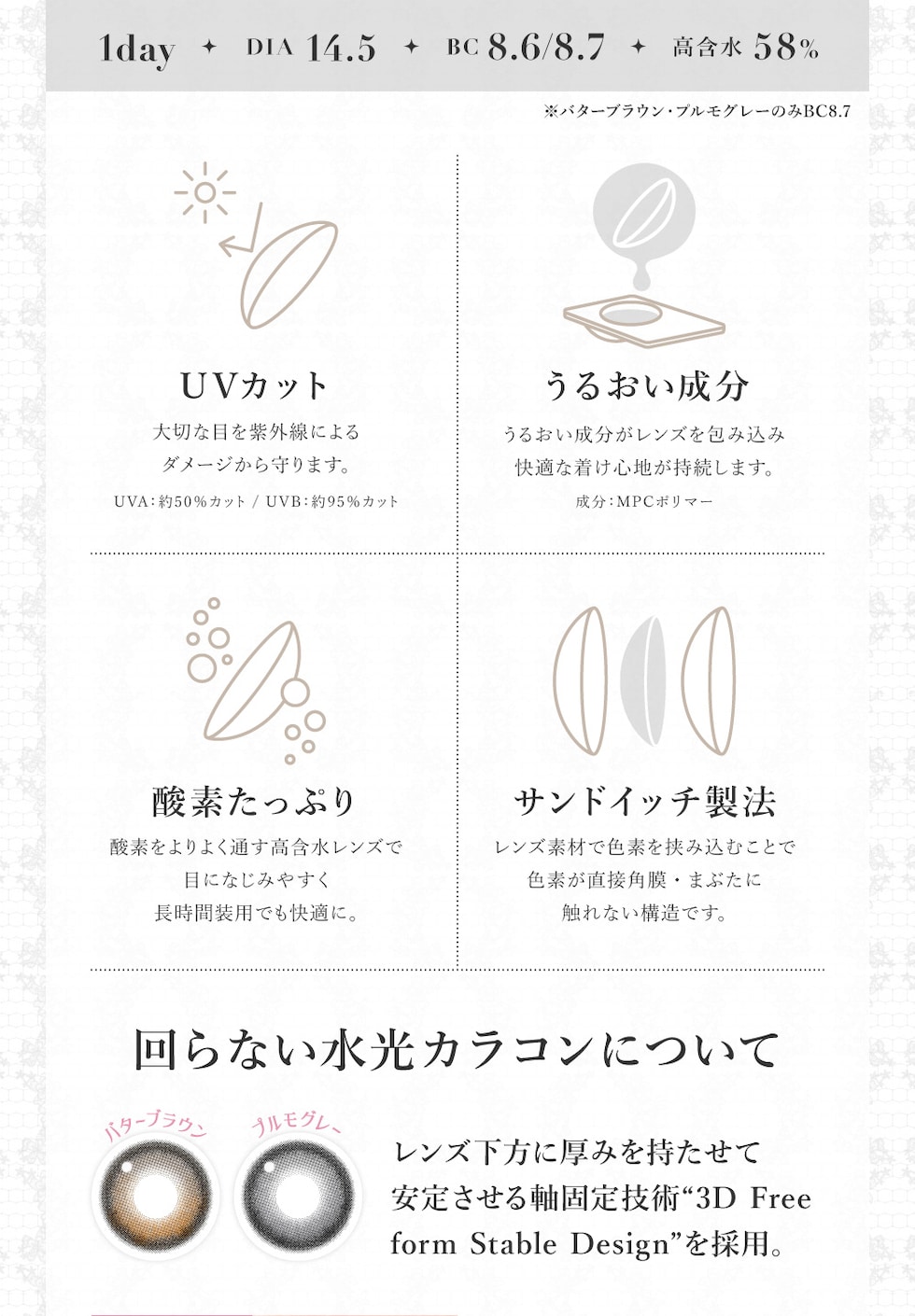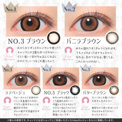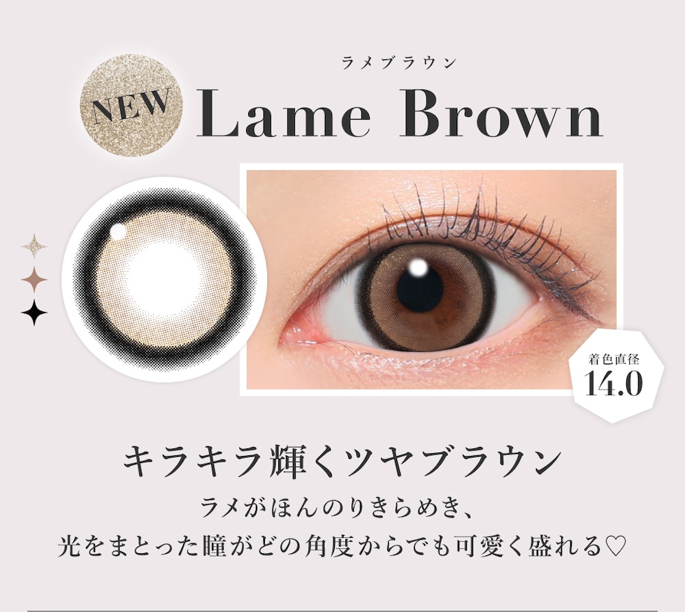 | BC(ベースカーブ) | -8.7mm- バターブラウン / プルモグレー -8.6mm- ラメベージュ / ラメブラウン / バニラブラウン / モモピンク / ラテベージュ / ダークモカ / グレージュ / ピンクベージュ / NO.1チョコレート / NO.3ブラウン / NO.5ブラック / NO.6ブラウン / NO.9ブラウン / NO.14ヘーゼル / クリアグレー / シマーブラウン |