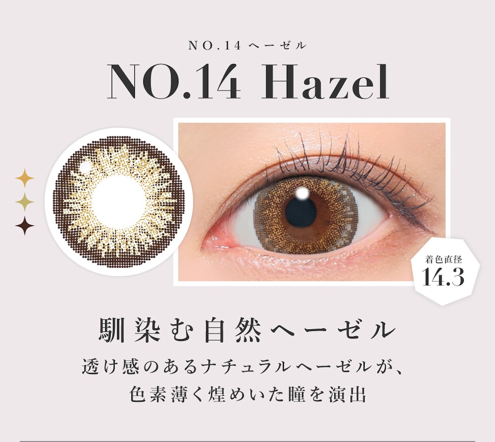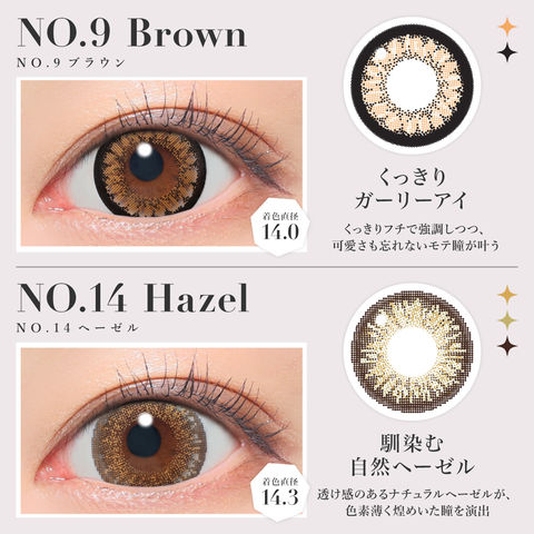 -14.3mm- ダークモカ / NO.1チョコレート / NO.3ブラウン / NO.5ブラック / NO.6ブラウン / NO.14ヘーゼル -14.1mm- ピンクベージュ -14.0mm- ラメベージュ / ラメブラウン / バターブラウン / プルモグレー / NO.9ブラウン / クリアグレー / シマーブラウン -13.9mm- バニラブラウン / モモピンク / グレージュ -13.7mm- ラテベージュ |