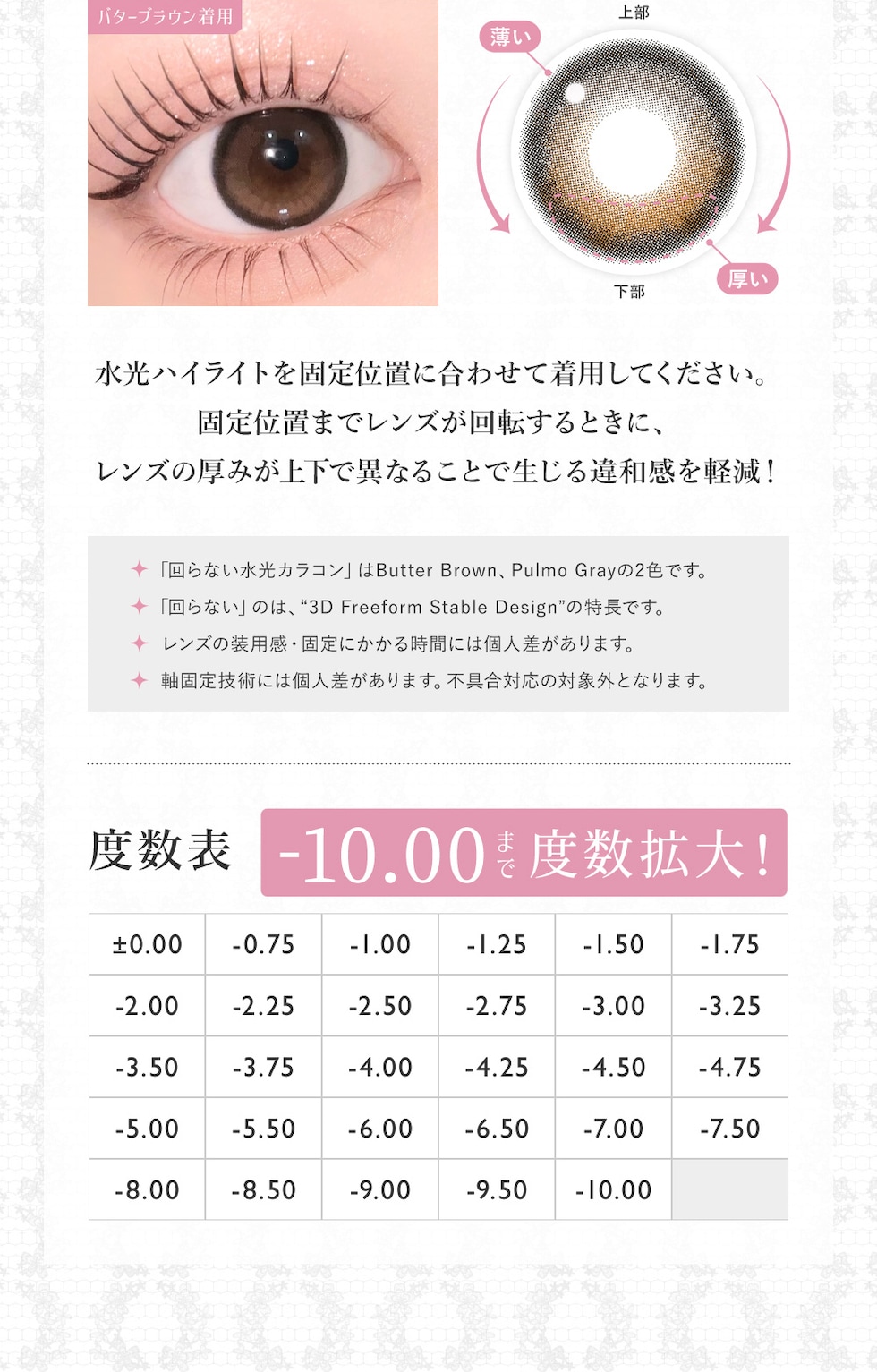 ±0.00(度なし) -0.75~-5.00(0.25単位) -5.50~-10.00(0.50単位) |