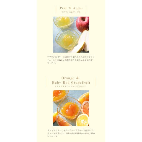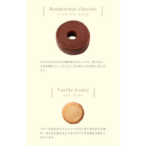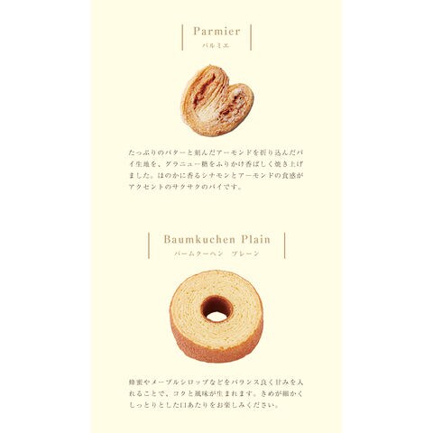 | パウンドケーキ バター 1個 パルミエ 1個 バームクーヘン プレーン 2個 バームクーヘン ショコラ 2個 バニラクッキー 3個 デザートゼリー ラフランス&アップル 1個 デザートゼリー オレンジ&ルビーグレープフルーツ 1個 デザートゼリー マンゴー&オレンジ 1個 デザートゼリー コンコード 1個 計9種13個入 |