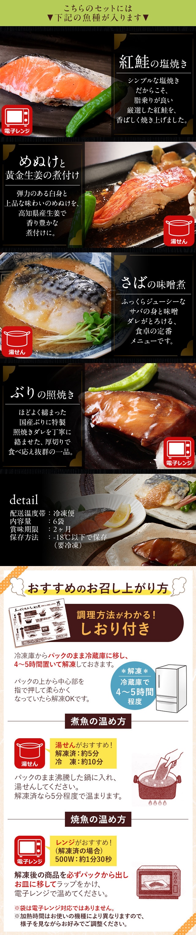 【紅鮭の塩焼き】60g×1袋 【めぬけと黄金生姜の煮付け】100g×1袋 【さばの味噌煮】90g×2袋 【ぶりの照焼き】90g×2袋 |