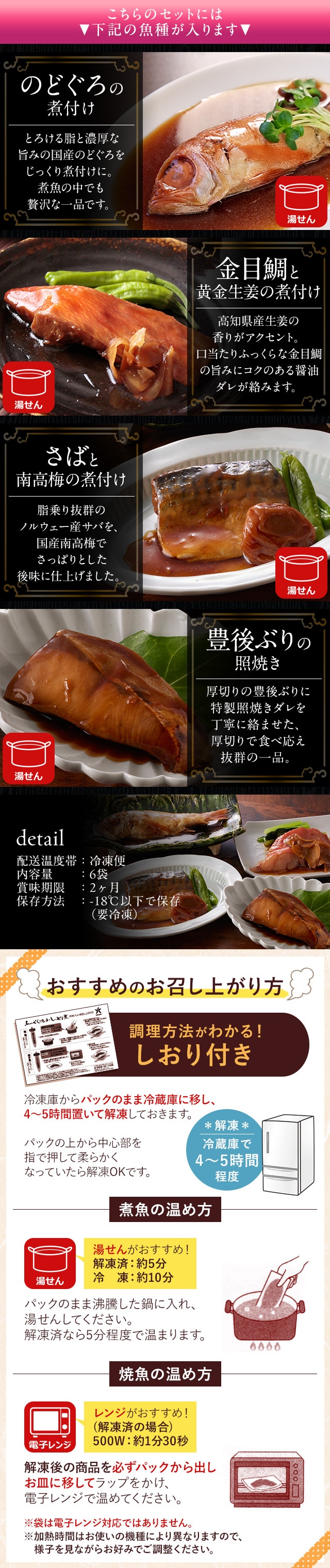 【のどぐろの煮付け】85g×1袋 【金目鯛と黄金生姜の煮付け】100g×2袋 【さばと南高梅の煮付け】110g×2袋 【豊後ぶりの照焼き】90g×1袋 |