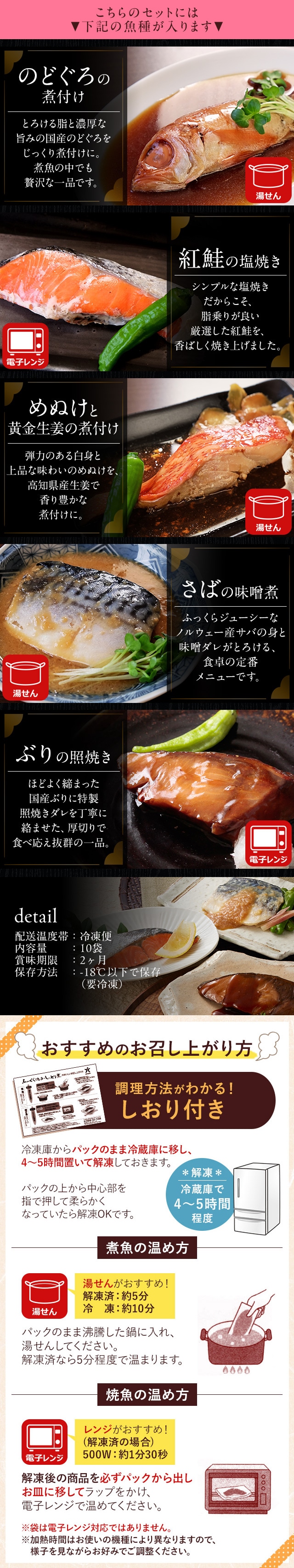 【のどぐろの煮付け】85g×2袋 【紅鮭の塩焼き】60g×2袋 【めぬけと黄金生姜の煮付け】100g×2袋 【さばの味噌煮】90g×2袋 【ぶりの照焼き】90g×2袋 |