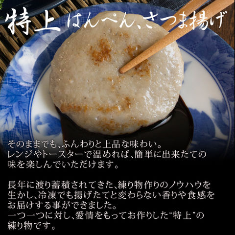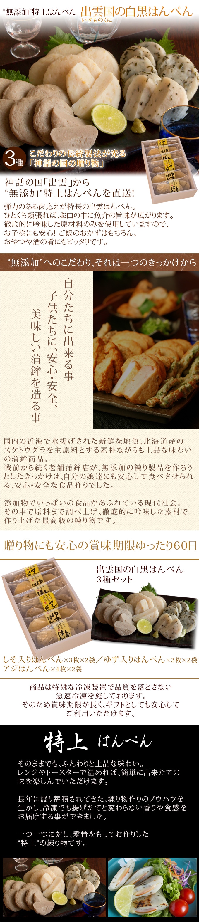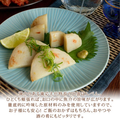 神話の国「出雲」から、"無添加"特上はんぺんを直送。徹底的に吟味した原材料のみを使用していますのでギフトにも安心です(練り物は「しそ入りはんぺん」「ゆず入りはんぺん」「アジはんぺん」の3種入り)。