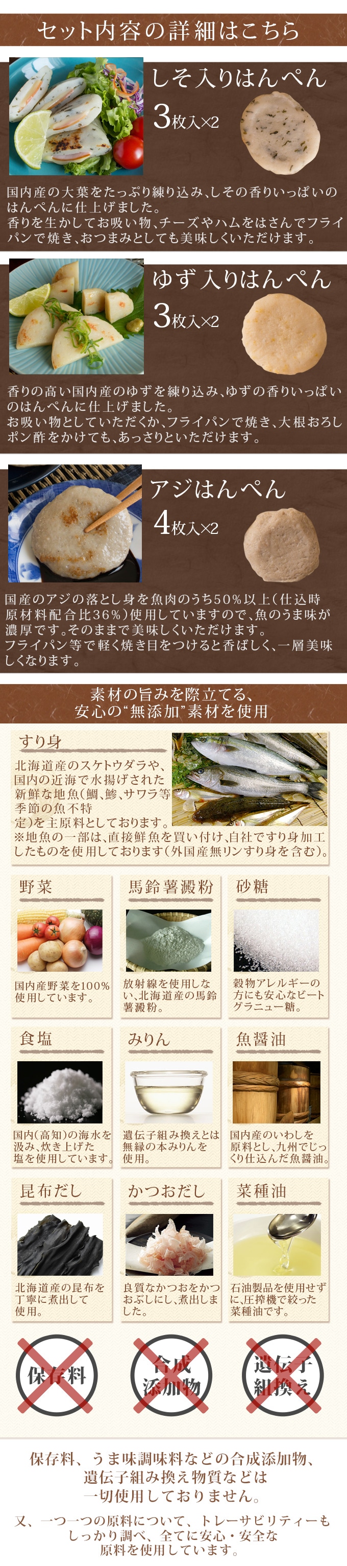 原材料名 【しそ入りはんぺん】魚肉(日本)、馬鈴薯澱粉、砂糖、しそ(大葉(日本))、味醂、食塩、魚醤(イワシ、食塩)、鰹だし、昆布だし