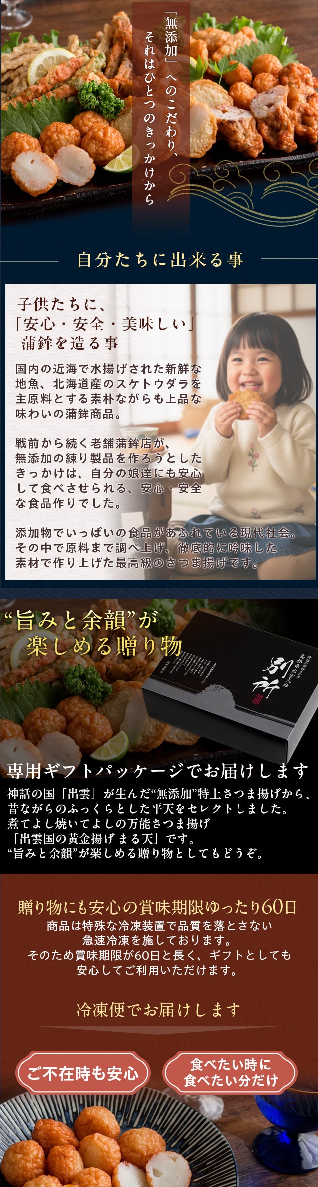 | 神話の国「出雲」が生んだ“無添加”特上さつま揚げから、昔ながらのふっくらとした食感で人気の「イカ天」「おじいちゃんの天ぷら」「きくらげ天」「ささがきごぼう天」「ふんわり玉ねぎ天」の5種をセレクト。煮てよし焼いてよしの万能さつま揚げ「出雲国の黄金揚げ まる天」です。徹底的に吟味した原材料のみを使用、特殊な装置で品質を落とさない急速冷凍を施すため、揚げたてと変わらない風味や食感が長期間保たれます。“旨みと余韻”が楽しめる贈り物としてもどうぞ。 [用途]父の日プレゼント 母の日プレゼント 敬老の日プレゼント お中元ギフト お歳暮ギフト プレゼント ギフト |