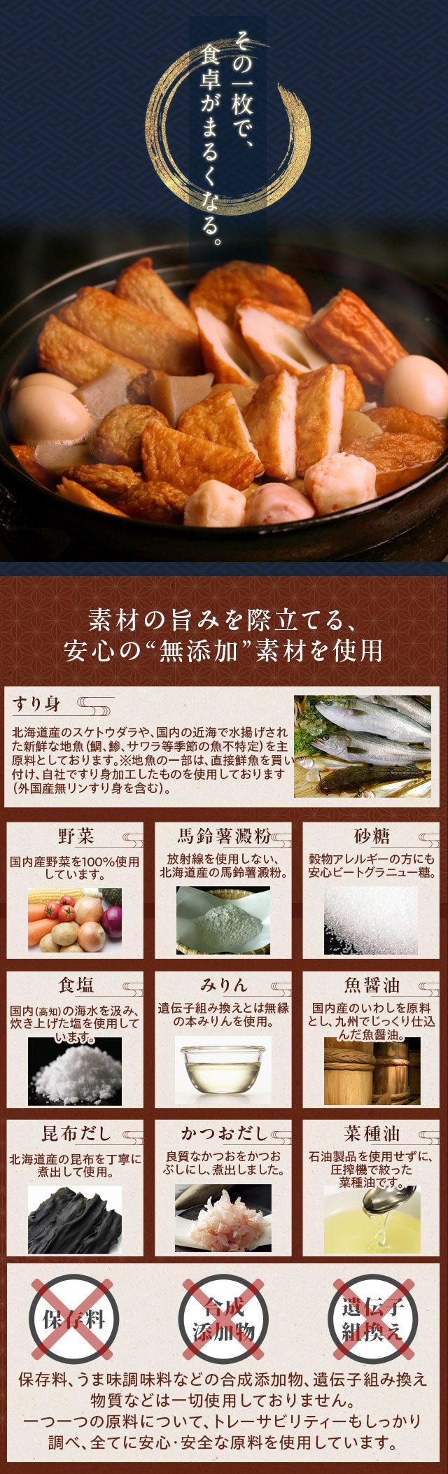 | 原材料名 | 【イカ天】魚肉(日本)、イカ(日本)、食用菜種油、馬鈴薯澱粉、砂糖、魚醤(イワシ、食塩)、食塩、鰹だし、昆布だし、味醂 【おじいちゃんの天ぷら】魚肉(日本)、食用菜種油、馬鈴薯澱粉、砂糖、魚醤(イワシ、食塩)、食塩、鰹だし、昆布だし、味醂 【きくらげ天】魚肉(日本)、食用菜種油、馬鈴薯澱粉、砂糖、魚醤(イワシ、塩蔵)、乾燥きくらげ(きくらげ(日本))、食塩、鰹だし、昆布だし、味醂 【ささがきごぼう天】魚肉(日本)、ごぼう(日本)、食用菜種油、馬鈴薯澱粉、砂糖、魚醤(イワシ、食塩)、食塩、鰹だし、昆布だし、味醂 【ふんわり玉ねぎ天】魚肉(日本)、玉ねぎ(国産)、食用菜種油、馬鈴薯澱粉、砂糖、魚醤(イワシ、食塩)、食塩、鰹だし、昆布だし、味醂 |