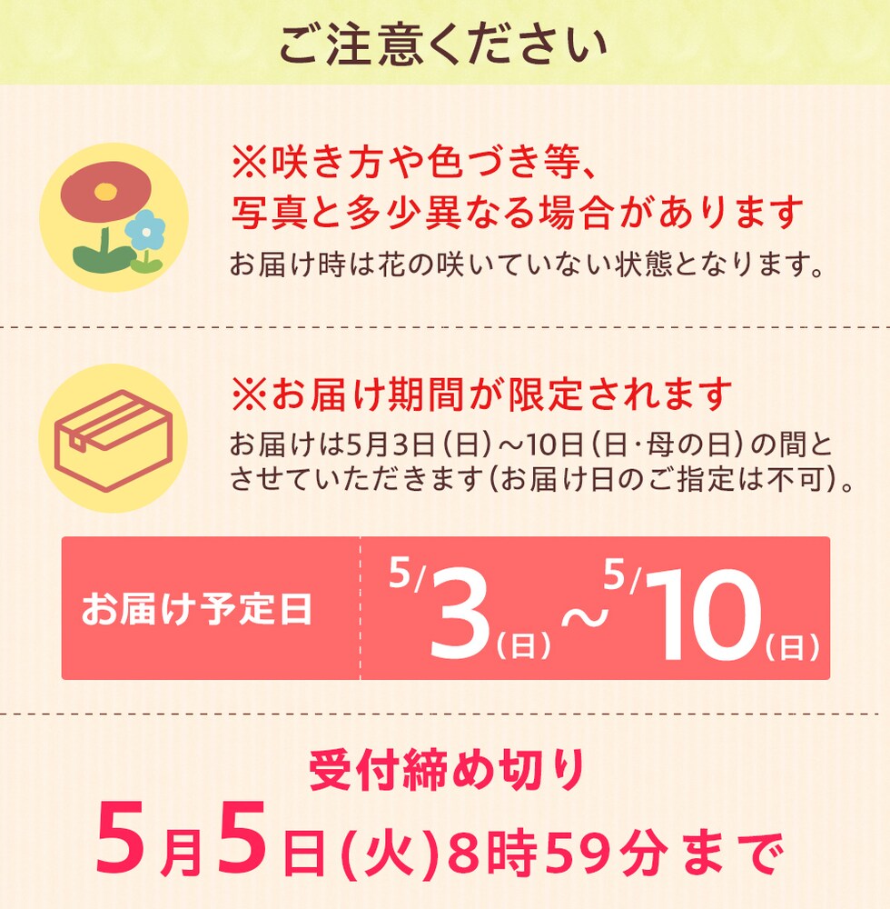 - 5月3日~10日のお届け(ご指定は不可)
