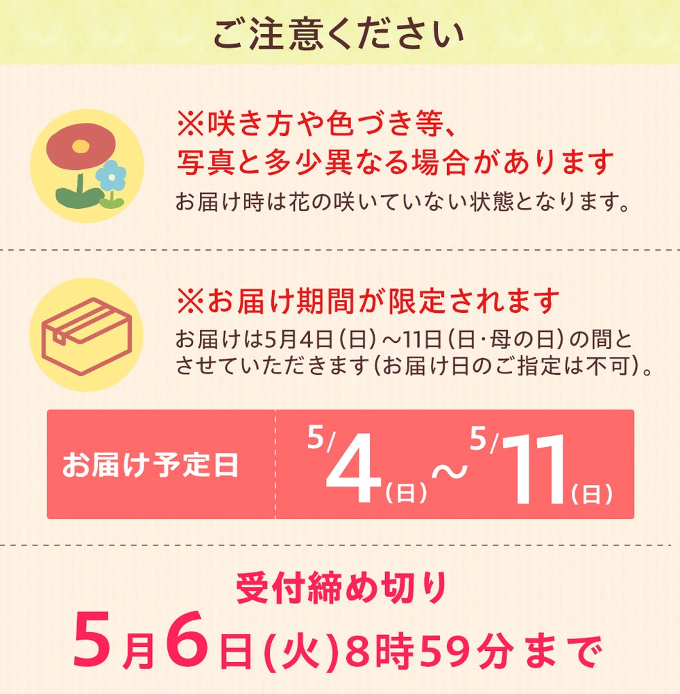 - 5月4日~11日のお届け(ご指定は不可)