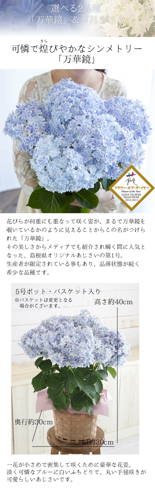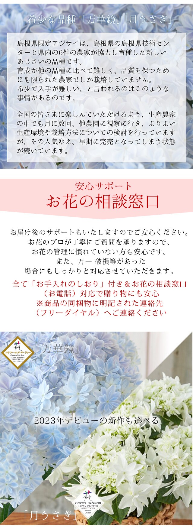 | 花材 | あじさい「万華鏡」5号 ※つぼみを含んだ状態でお届けします。 |