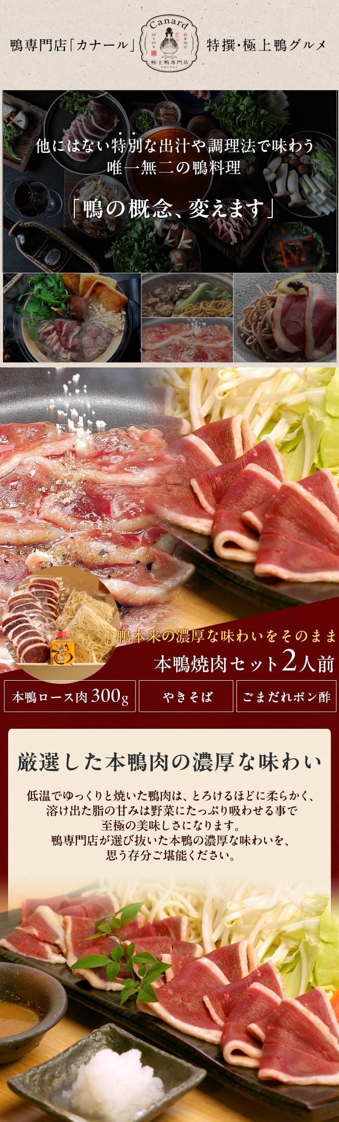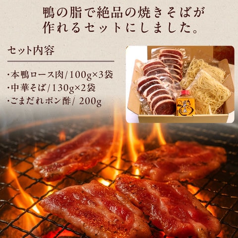 | 内容量 | 2人前(本鴨ロース肉100g×3袋、焼きそば130g×2袋、ごまだれポン酢200g) |