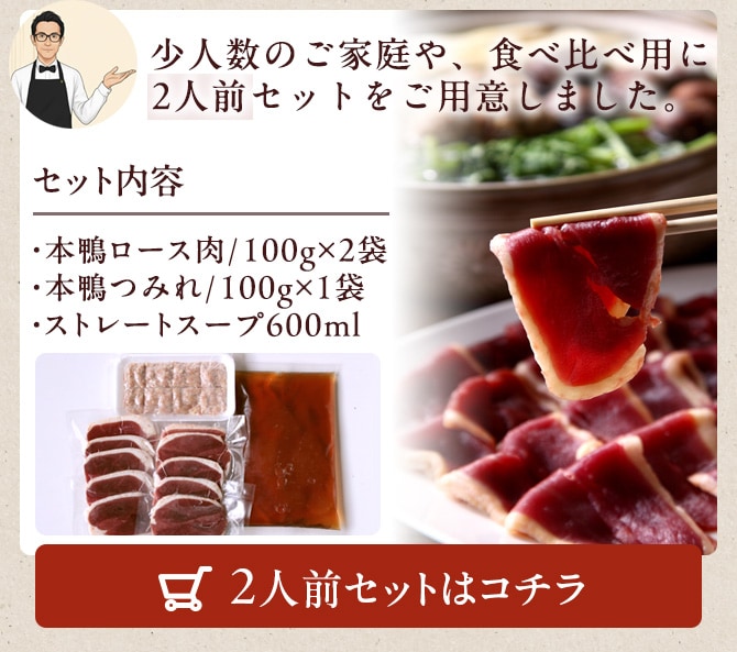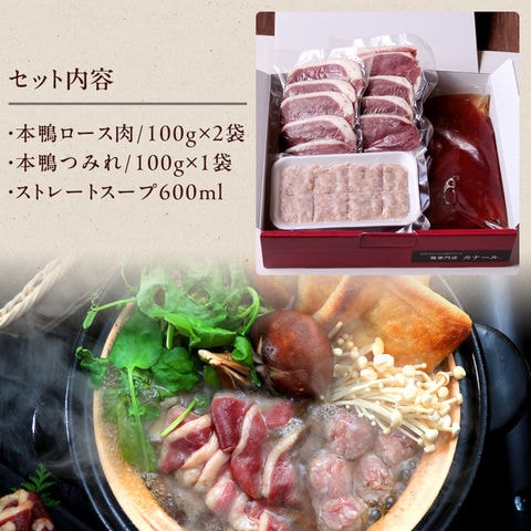| 内容量 | 2人前(本鴨ロース肉100g×2袋、鴨つみれ100g×1袋、スープ600ml×1袋) |