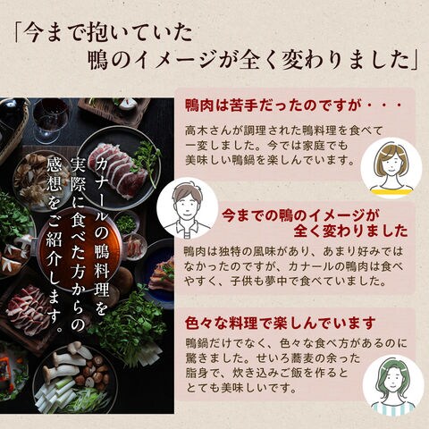 | 原材料 | 【なまそば】そば粉(そば(島根県産))、食塩 【鴨肉】鴨肉(タイ産)、食塩 【調味塩】食塩(国内製造)、野生植物抽出ミネラル(昆布、ワカメ、竹、松葉、ビワ葉、イタドリ、熊笹、クズ葉、ヨモギ、ドクダミ、スギナ、その他) |