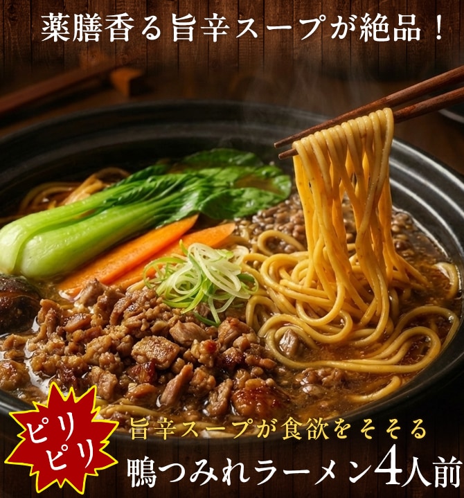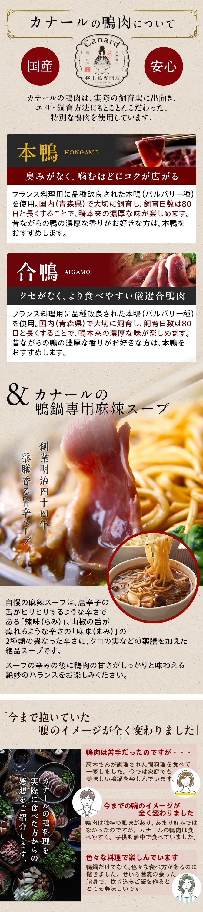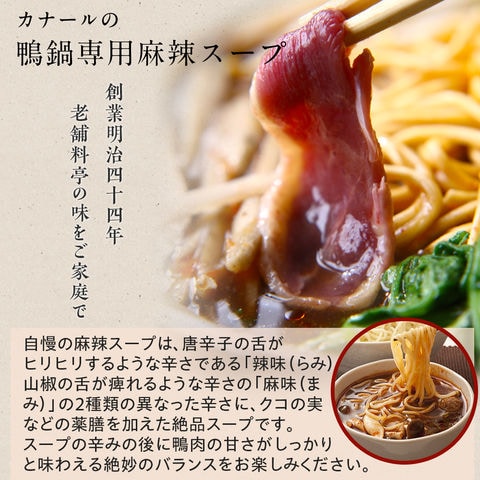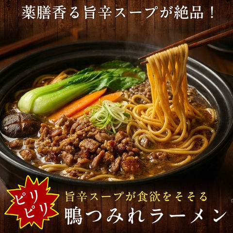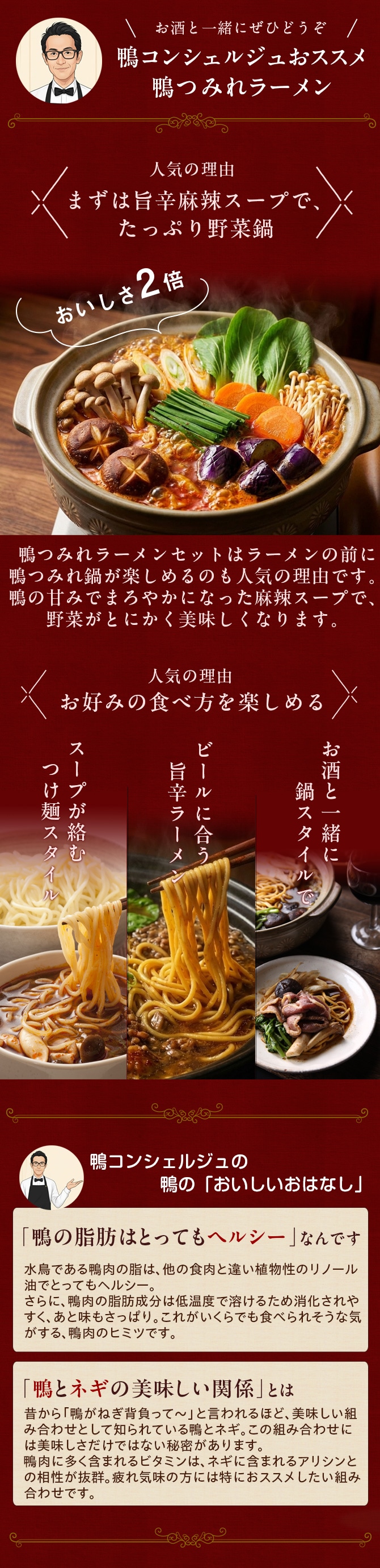 | 原材料 | 【鴨つみれ】鴨肉(青森県産)、鶏卵、コーンフラワー、馬鈴薯でん粉、食塩、こしょう 【中華そば】小麦粉、卵白、食塩、加工でん粉、かん粉、クチナシ色素 【麻辣スープ】水あめ、醤油(小麦を含む)、トウチ、豆板醤、食塩、チキンエキス、しょうが、ごま油ねぎ油、にんにく、唐辛子、山椒、酵母エキス、クコの実エキス |
