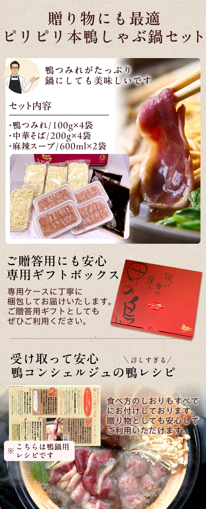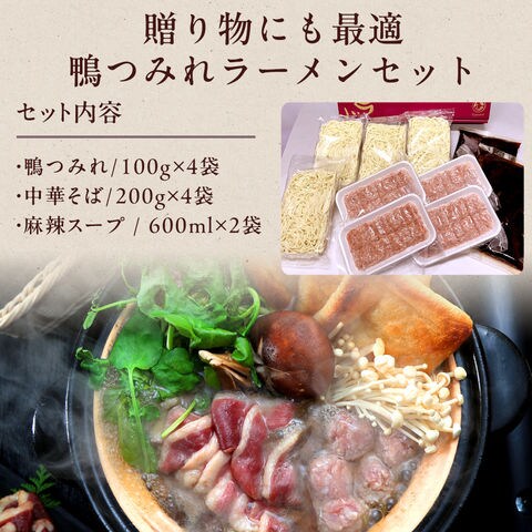 | 内容量 | 4人前(本鴨つみれ100g×4袋、中華そば200g×4袋、麻辣スープ600ml×2袋) |