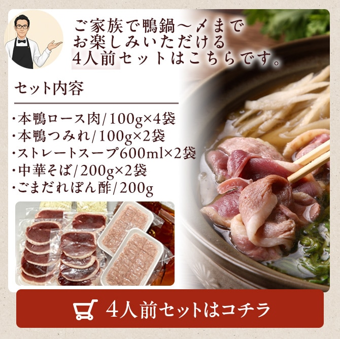 | 内容量 | 4人前(本鴨ロース肉100g×4袋、本鴨つみれ100g×2袋、中華そば200g×2袋、スープ600ml×2袋、ごまだれポン酢200g) |