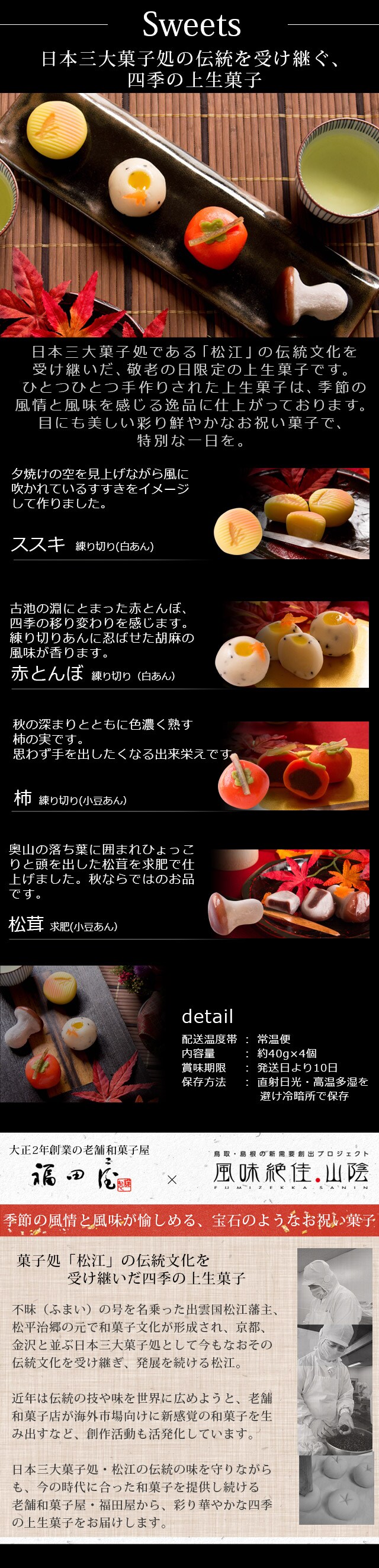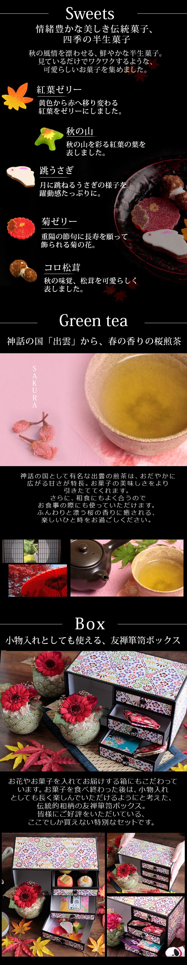 | 保存方法 | 【上生菓子・半生菓子】直射日光・高温多湿を避け冷暗所で保存 【桜煎茶】高温多湿を避け移り香に注意して保存 |