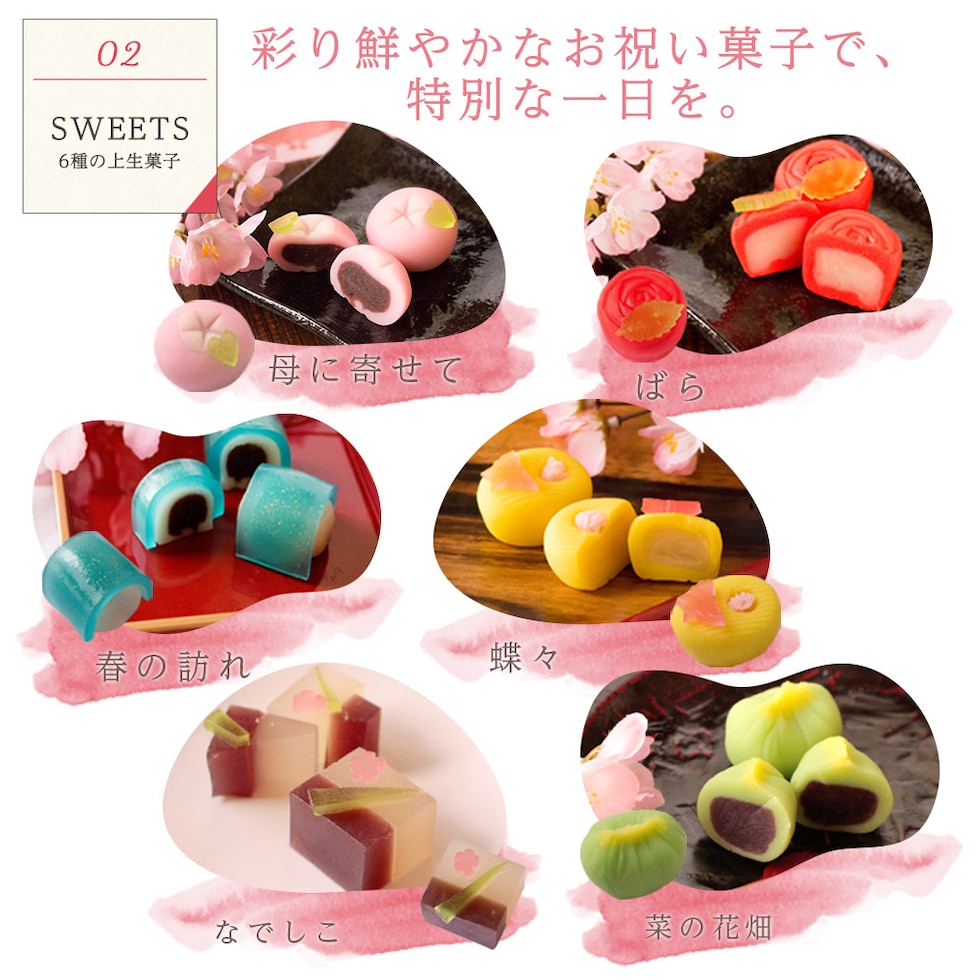 | 原材料名 | 【上生菓子】白練り切り餡(白生餡、砂糖、水あめ、もち粉)(国内製造)、砂糖、白生餡(ベビーライマ)、生餡(小豆)、水あめ、寒天、やまいも、食塩/甘味料(ソルビトール)、トレハロース、着色料(黄4、金箔、赤106、赤3、青1、黄5)、(一部にやまいもを含む) 【桜煎茶】緑茶(国産)、桜葉の砂糖漬け(国産) |