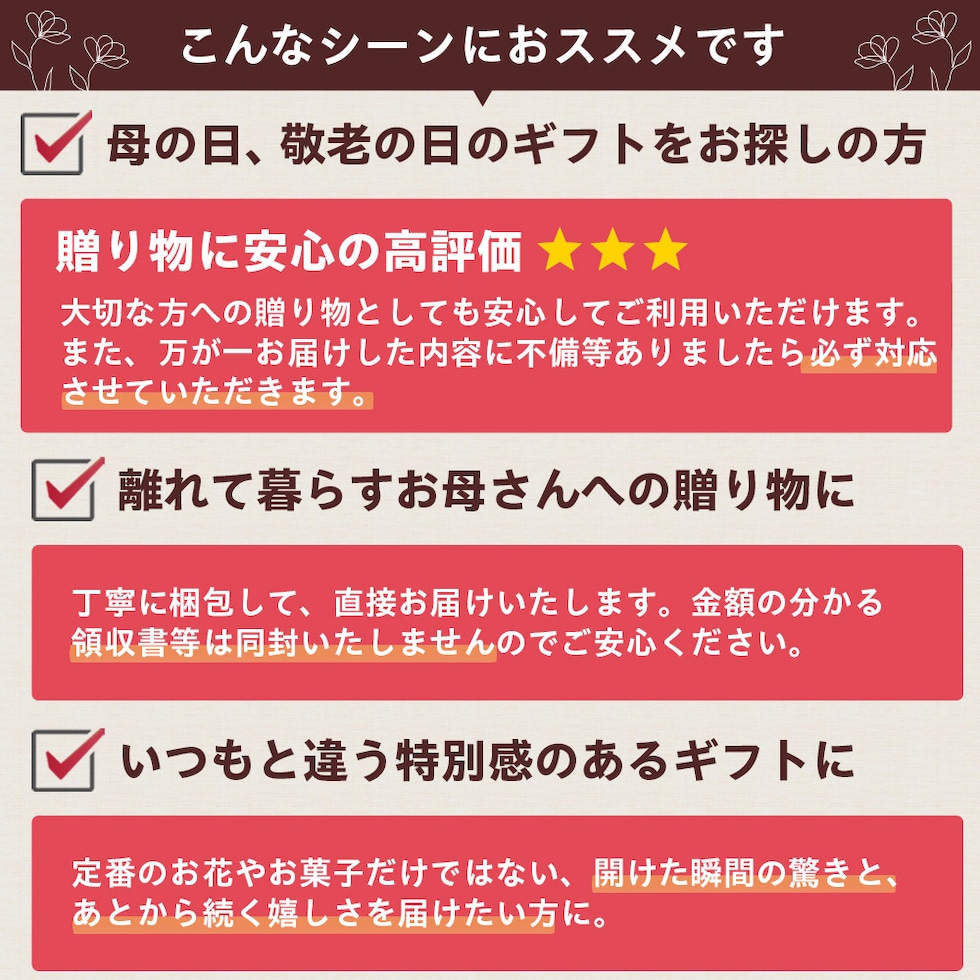 - 5月5日以降の着日指定可(お届け日指定がない場合は母の日当日か前日着)