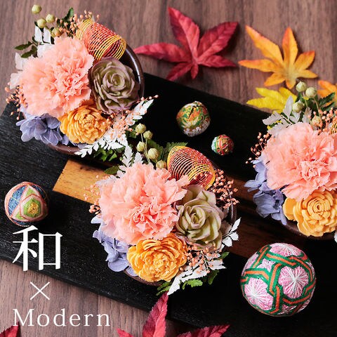 | 花材 | カーネーション、ソーラーダリア、ソーラーローズ、ヒメワラビ、リボン、リンフラワー、カスミ草、ピラミッドアジサイ、器 |