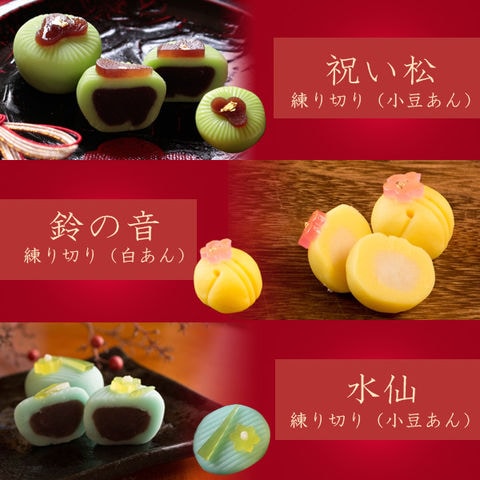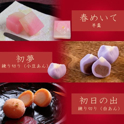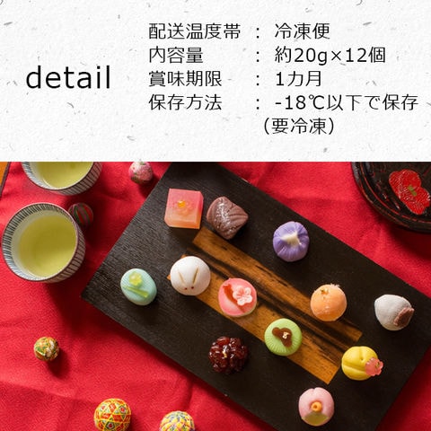 | 原材料名 | 白練切餡(白生餡、砂糖、水あめ、もち粉)(国内製造)、砂糖、白生餡(ベビーライマ)、生餡(小豆)、水あめ、餅粉(もち米)、小豆、やまいも、上用粉(うるち米)、麦芽糖、卵白、米粉加工品、寒天、ごま/甘味料(ソルビトール)、トレハロース、着色料(金箔、黄4、青1、赤106、赤3、黄5)、(一部に卵・ごま・やまいもを含む) |