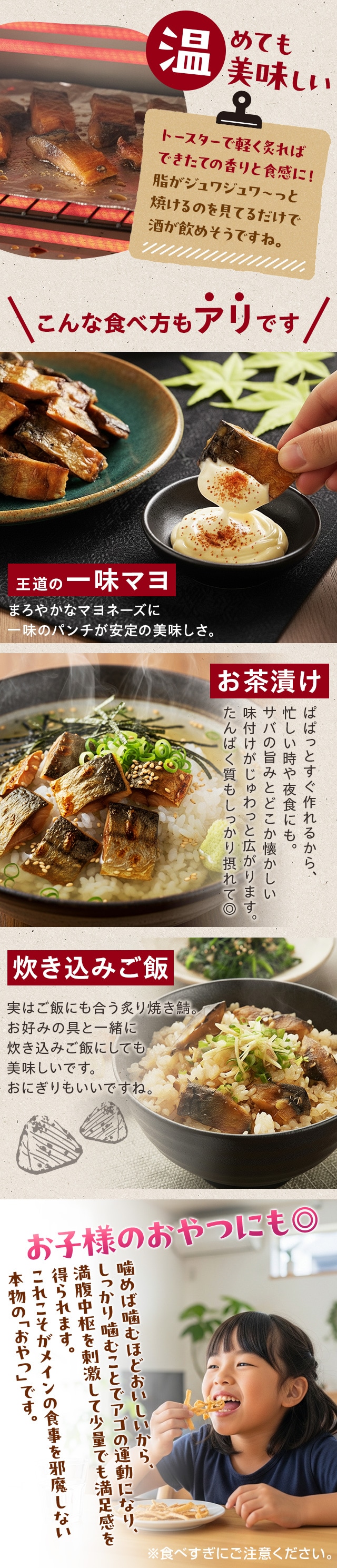 | 原材料名 | さば加工品(さば(国産)、砂糖、食塩)/ソルビトール、調味料(アミノ酸等) |