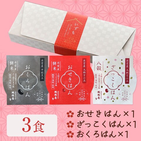 【おせきはん】もち米(島根県産)、大納言小豆(島根県出雲市産)、藻塩(海水(島根県出雲市産)、あらめ(島根県出雲市産)) 【ざっこくはん】もち米(島根県産)、大納言小豆(島根県出雲市産)、おしむぎ(香川県産)、赤米(千葉県産)、黒米(千葉県産)、もちあわ(北海道産)、もちひえ(北海道産)、アマランサス(岩手県)、藻塩(海水(島根県出雲市産)、あらめ(島根県出雲市産)) 【おくろはん】もち米(島根県産)、黒豆(島根県産もしくはその他の国産)、藻塩(海水(島根県出雲市産)、あらめ(島根県出雲市産)) |