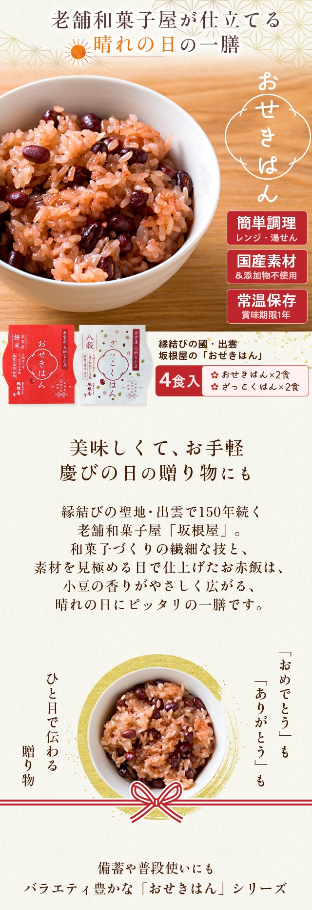 お歳暮 ギフト 縁結びの國・出雲 坂根屋の「おせきはん」4個入 無添加 国産原料 赤飯 お赤飯 おこわ おふかし 雑穀ごはん レトルト レンジで温めるだけ お祝い 贈り物 ギフト プレゼント 送料無料(北海道・沖縄を除く)