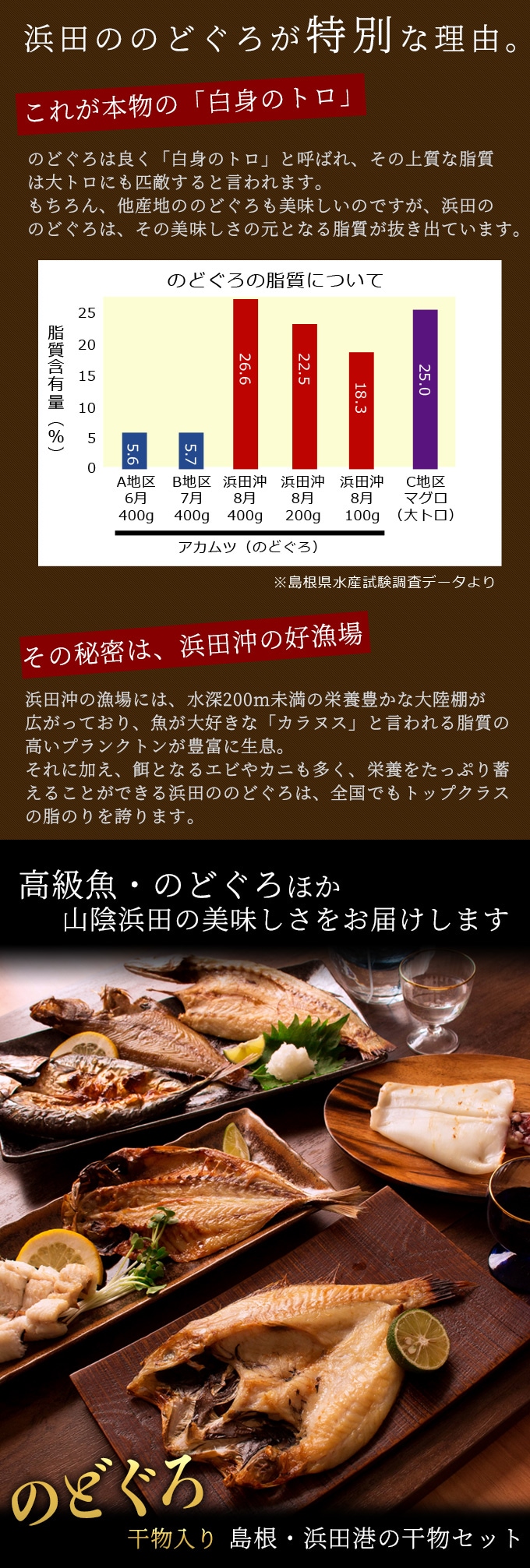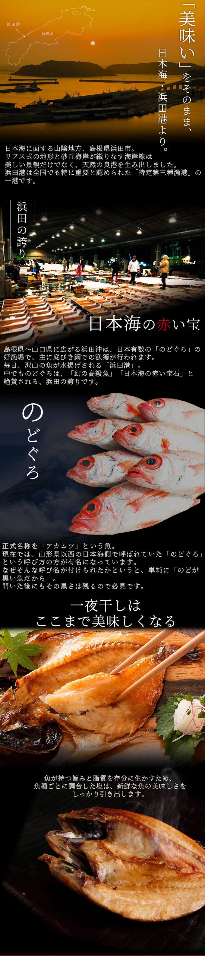 | 原材料名 | 【ノドグロ開き】ノドグロ/アカムツ(国産または韓国産)、食塩 【アジ開き】アジ(山陰沖産)、食塩、還元水飴/pH調整剤、酸化防止剤(V.C、チャ抽出物) 【エテカレイ干し】エテカレイ(山陰沖産)、食塩/pH調整剤、酸化防止剤(V.C) 【レンコ鯛開き】レンコ鯛(山陰沖産)、食塩/pH調整剤、酸化防止剤(V.C)、着色料(紅麹色素) 【サバ開き】マサバ(山陰沖産)、食塩/酸化防止剤(ビタミンC) 【カマス開き】カマス(山陰沖産)、食塩 【剣先イカ開き】剣先イカ(山陰沖産)、食塩 ※のどぐろは島根県産以外に、時期によっては同じ日本海海域で水揚げされた山口県産や韓国産等が含まれる場合があります。 ※不漁の際は干物の種類が一部変更になる場合があります。 |