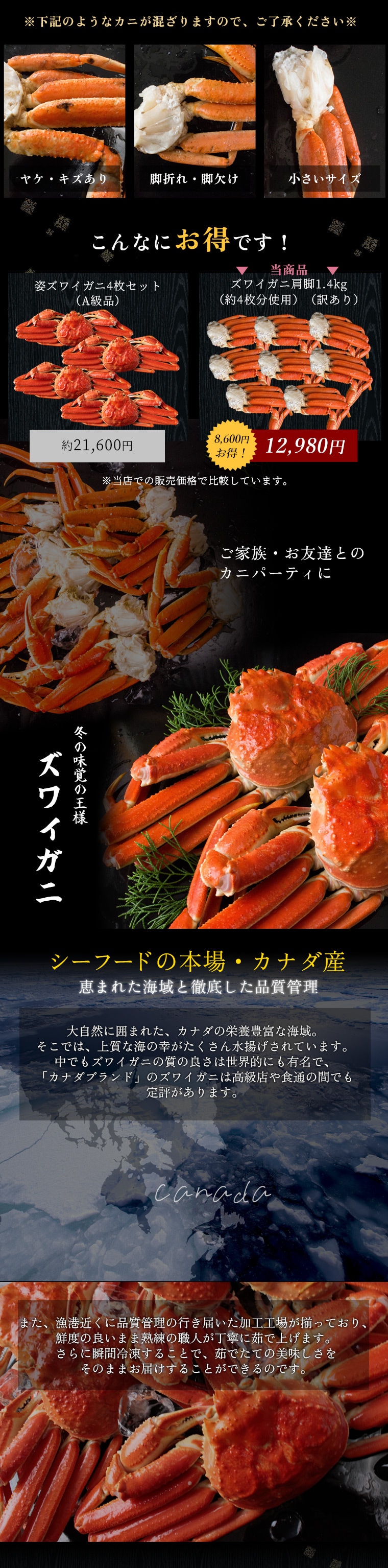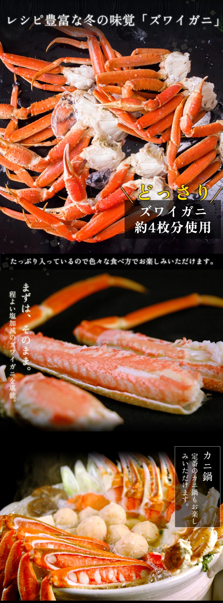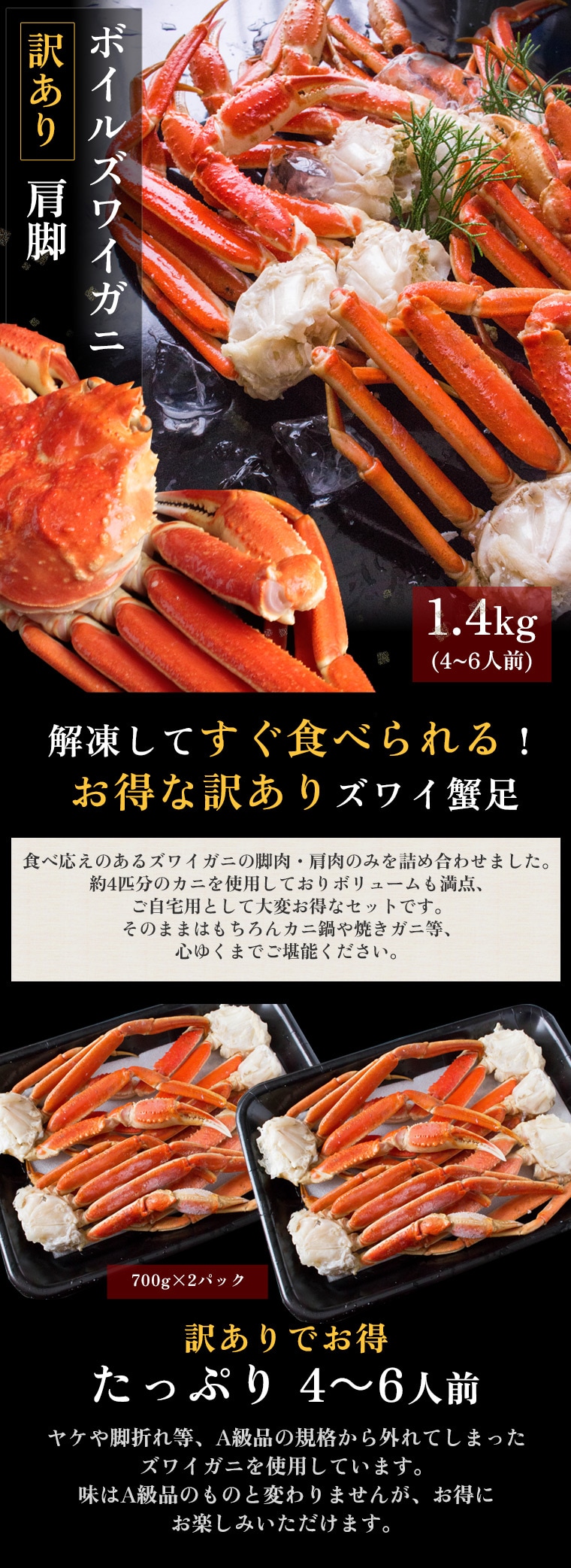 | 食べ応えのあるズワイガニの脚肉・肩肉のみを詰め合わせました。約4匹分のカニを使用しておりボリュームも満点、ご自宅用として大変お得なセットです。そのままはもちろんカニ鍋や焼きガニ等、心ゆくまでご堪能ください。 |