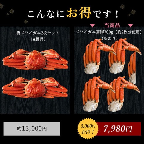 | 食べ応えのあるズワイガニの脚肉・肩肉のみを詰め合わせました。約2匹分のカニを使用しておりボリュームも満点、ご自宅用として大変お得なセットです。そのままはもちろんカニ鍋や焼きガニ等、心ゆくまでご堪能ください。 |