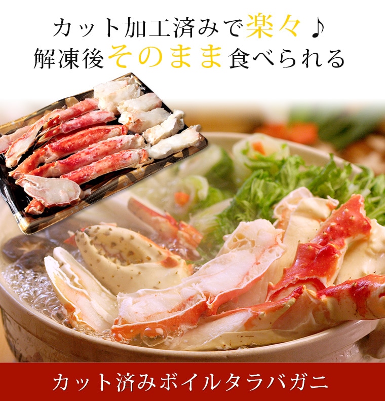| ぎっしりと身が詰ったタラバガニを食べやすくカットしていますので、解凍するだけでお鍋やお料理にお使いいただけます。茹でたての食感はそのまま、産地や加工法にもこだわったタラバガニ。ボイルならではの身離れの良さでお子様にも簡単にカニの美味しさを味わっていただけます。 |