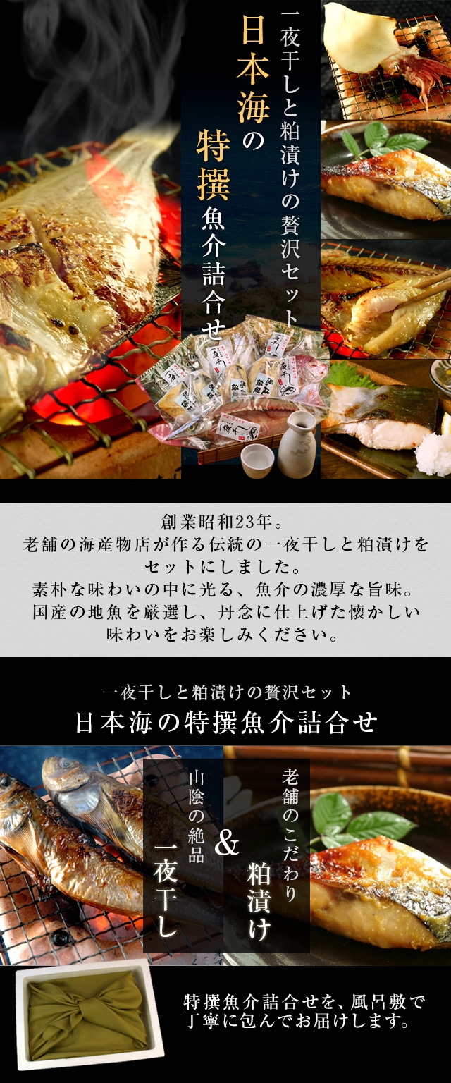 | 素材はすべて天然・日本海産から厳選。「一夜干し」と「粕漬け」の贅沢セットを特別なギフト用に。懐かしの昭和の味・復刻版です。もらってうれしい風呂敷包みでお届けします。 ※お届けする一夜干しは「アジ」「カレイ」など、粕漬けは「タイ」「サワラ」など、山陰沖で水揚げされる数種類の魚の中からのおまかせとなります。 [用途]父の日プレゼント 母の日プレゼント 敬老の日プレゼント お中元ギフト お歳暮ギフト プレゼント ギフト |