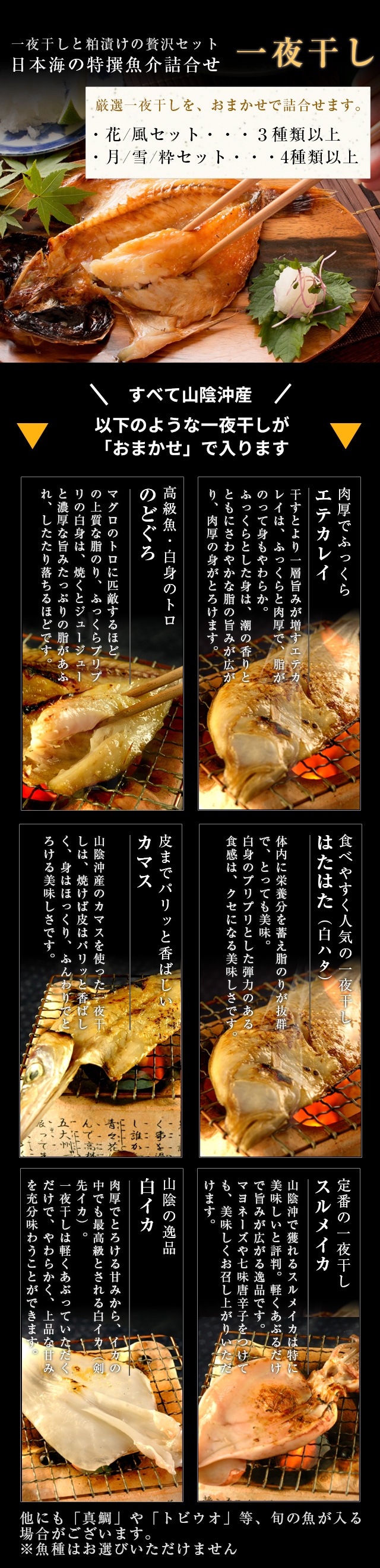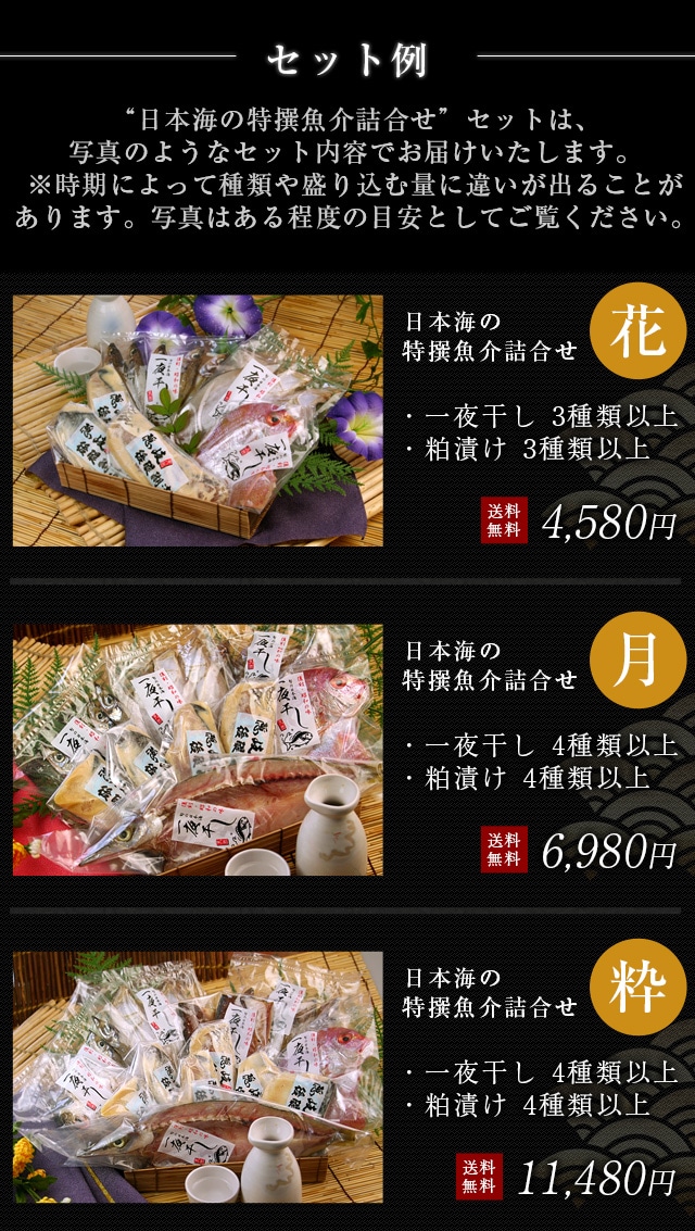 | 内容量 | 【一夜干し】4種類以上 【粕漬け】4種類以上 |