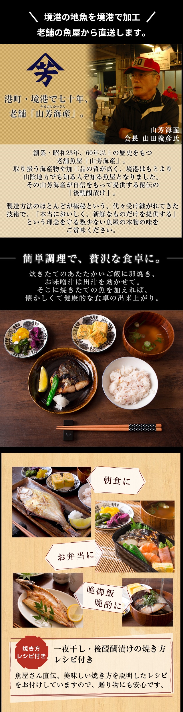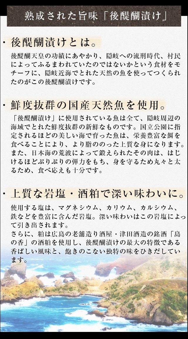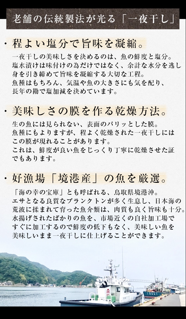 | 原材料名 | 【一夜干し】各種鮮魚(鳥取県産)、食塩 【粕漬け】各種鮮魚(鳥取県産)、米、米こうじ、醸造用アルコール、醸造用糖類、水あめ、米および米こうじの醸造調味料、醸造酢、酸味料、原料糖、食塩/調味料(アミノ酸等)、着色料(カラメル)、(一部に大豆、小麦を含む) |