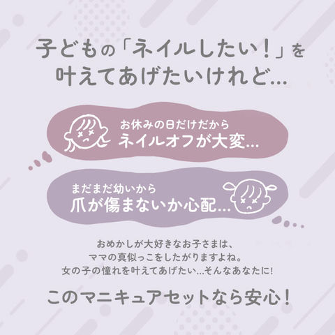 | 商品説明 | おめかしが大好きなキッズにぴったり。ママのマネっこができちゃう「はがせるマニキュア10本セット」が新登場。(対象年齢:6歳以上)【安心して使える水溶性ネイル】水を主成分として作られたマニキュア。爪に優しく、お子さまでも安心して楽しめるのがポイント!【ネイルオフも簡単】落とす時はリムーバー要らず◎水またはぬるま湯で、根本からゆっくり剥がすだけ。【キュートなキャラクターデザイン】お子さまに人気のキャラクターをデザインしたボトル☆並べて置いておくだけでも可愛いアイテム!【うれしい10本セット】コーデや気分に合わせて選べる10カラー。今日はどの色にしようか、悩む時間もワクワク♪ |