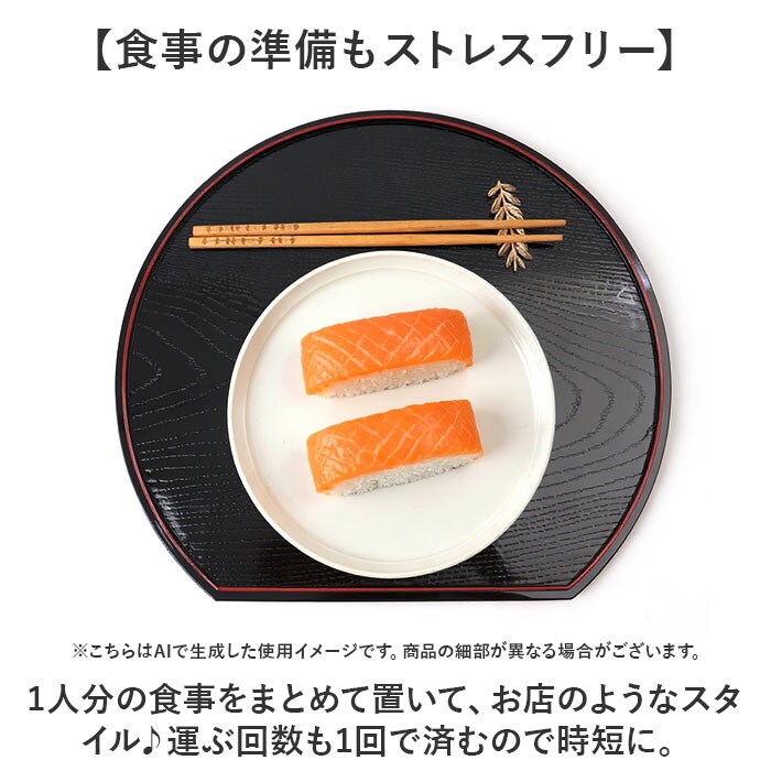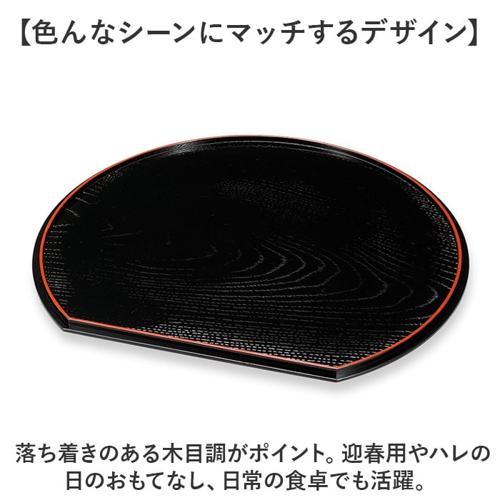 | 商品説明 | 【食卓にちょっとした特別感を】ハレの日も日常使いもお任せ◎シンプルでスタイリッシュな日本製「12.0木目半月盆」。【色んなシーンにマッチするデザイン】落ち着きのある木目調がポイント。迎春用やハレの日のおもてなし、日常の食卓でも活躍。【丸型よりも使いやすい半月型】丸型を一部カットしたような半月プレート。手前がまっすぐで、デッドスペースが生まれにくい!【食事の準備もストレスフリー】・1人分の食事をまとめて置いて、お店のようなスタイル♪運ぶ回数も1回で済むので時短に。【表面塗装済みで毎日使いに最適】表面にはウレタン塗装を。汚れや傷がつきにくく、気軽に使えるのが嬉しい! |