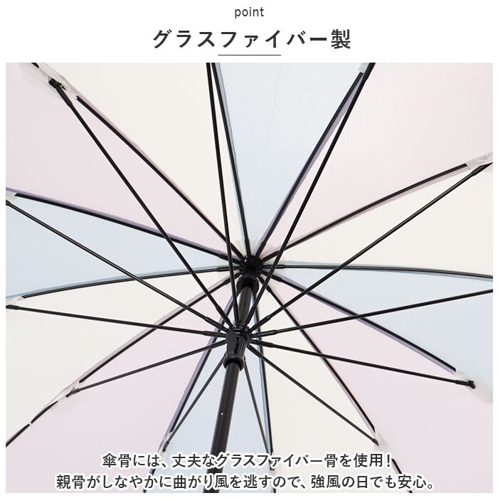 | 商品説明 | 12本骨で丈夫!おしゃれな傘で、雨の日も気分UP☆長傘 55cmが登場!【12本骨】一般的な傘に比べて、骨の数が多い12本骨。開いた時に美しい円形になるだけでなく、丈夫で風に強いという魅力も◎【グラスファイバー製】傘骨には、丈夫なグラスファイバー骨を使用!親骨がしなやかに曲がり風を逃すので、強風の日でも安心。【軽量】軽量なグラスファイバーとアルミの中棒を使用。軽いので、持ち歩きがしやすい。女性に嬉しい軽量設計。【晴雨兼用】傘生地は、アクリルコーティング加工済。紫外線防止効果があるので、晴れの日も雨の日も使える。※紫外線遮蔽率は、濃色生地で約90%、淡色生地で約80%が目安です。【手開きタイプ】狭い場所でも安全に開ける、手開きタイプ。指や爪をはさみにくい「安全ろくろ」を使用し、ボタンを押して開閉できる。【スナップボタン仕様】傘生地をまとめるバンドには留めやすいスナップボタン付き。パチッと簡単で使いやすい!【使いやすいサイズ感】女性でも使いやすい55cmサイズ。デイリー使いにちょうど良い◎ |