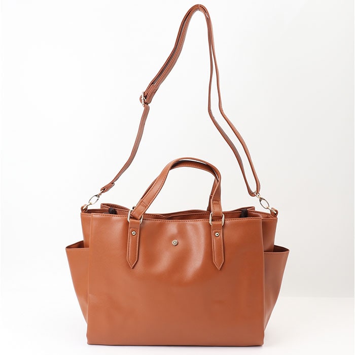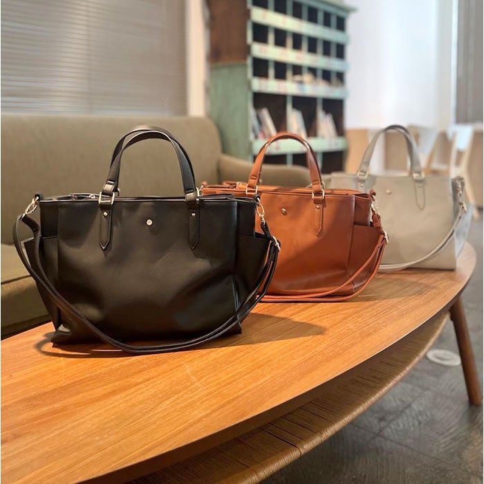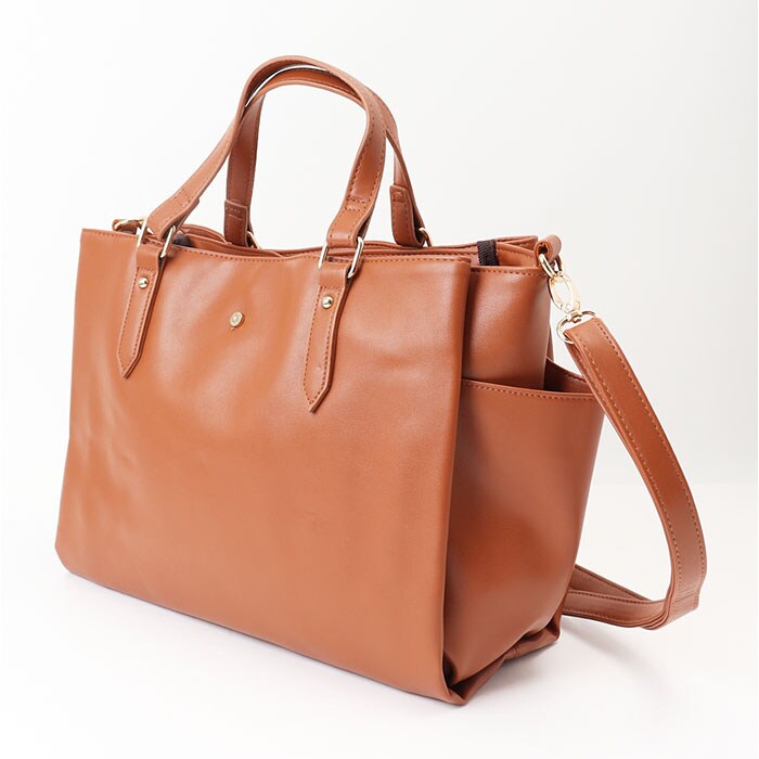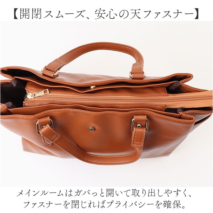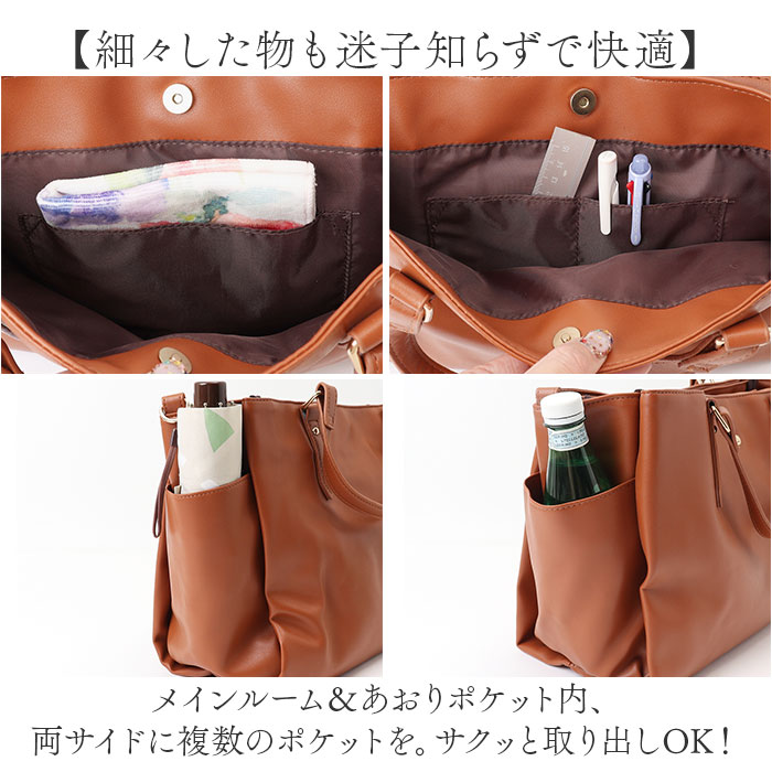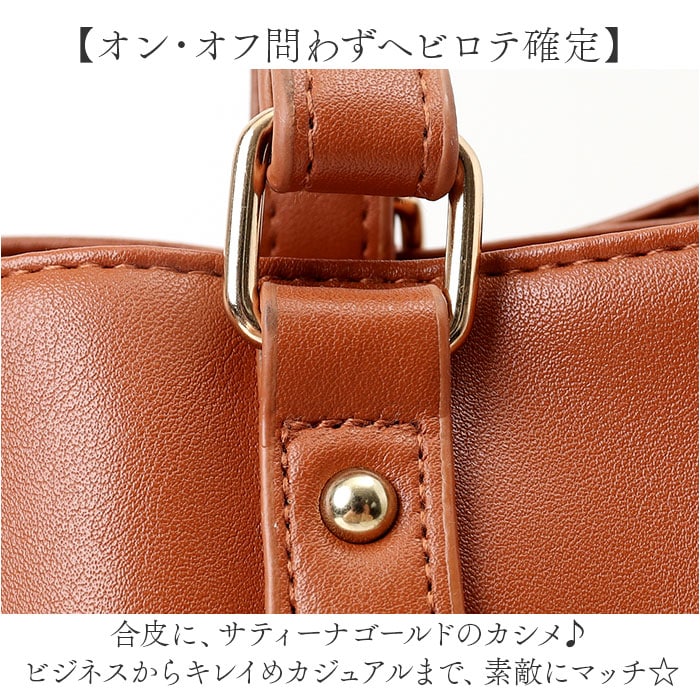 | 商品説明 | 【色んなシーンで頼りになる相棒】落ち着きのある上品な印象で、収納力も!「Lafiel サティーナカシメ2WAYバッグ」。【オン・オフ問わずヘビロテ確定】合皮に、サティーナゴールドのカシメ♪ビジネスからキレイめカジュアルまで、素敵にマッチ☆【お好みに合わせてスタイルチェンジ】手持ちで♪長さ調節可能なショルダーを取り付けて、肩掛けや斜め掛けも自在な2WAY。【整理整頓しやすい3スペース仕様】メインルームの他、前後にあおりポケットを装備した3層構造。荷物を定位置に収めやすい◎【開閉スムーズ、安心の天ファスナー】メインルームはガバっと開いて取り出しやすく、ファスナーを閉じればプライバシーを確保。【A4対応でざっくりひとまとめ】A4がぴったり。程よいマチを設け、ポーチや長財布などマストアイテムをすっきり収納可能。【安定した状態で荷物を持ち運び】取り外し可能な底板付き。荷物を入れていない状態でも自立し、安定性をキープ◎【マグネットボタンでワンタッチ開閉】力いらずで開閉できるあおりポケット。B5対応&スリムな小物を収納できて便利。【細々した物も迷子知らずで快適】メインルーム&あおりポケット内、両サイドに複数のポケットを。サクッと取り出しOK!【トレンドに左右されず長く愛用】年代や流行問わず持ちやすいフェミニンなデザイン&カラーリング。贈り物にもおすすめ。【ポケット仕様】メインルーム:ファスナーポケット×1、オープンポケット×2メインルーム前面:マグネット式あおりポケット×1(内側にオープンポケット×1)メインルーム後面:マグネット式あおりポケット×1(内側にオープンポケット×2)サイド:オープンポケット×2 |