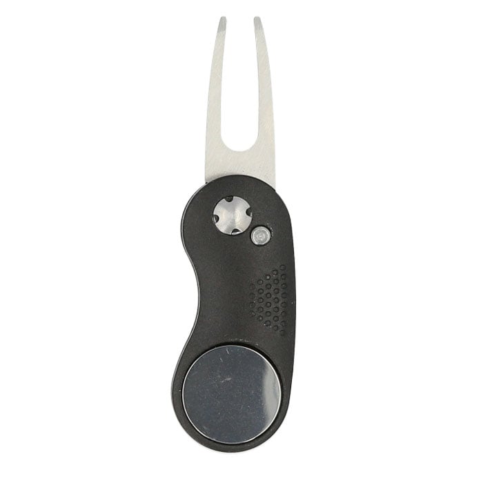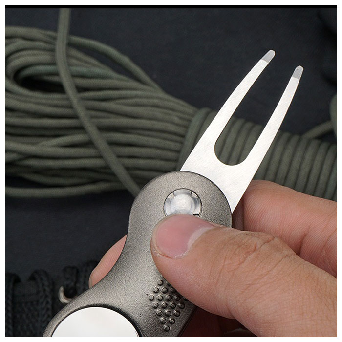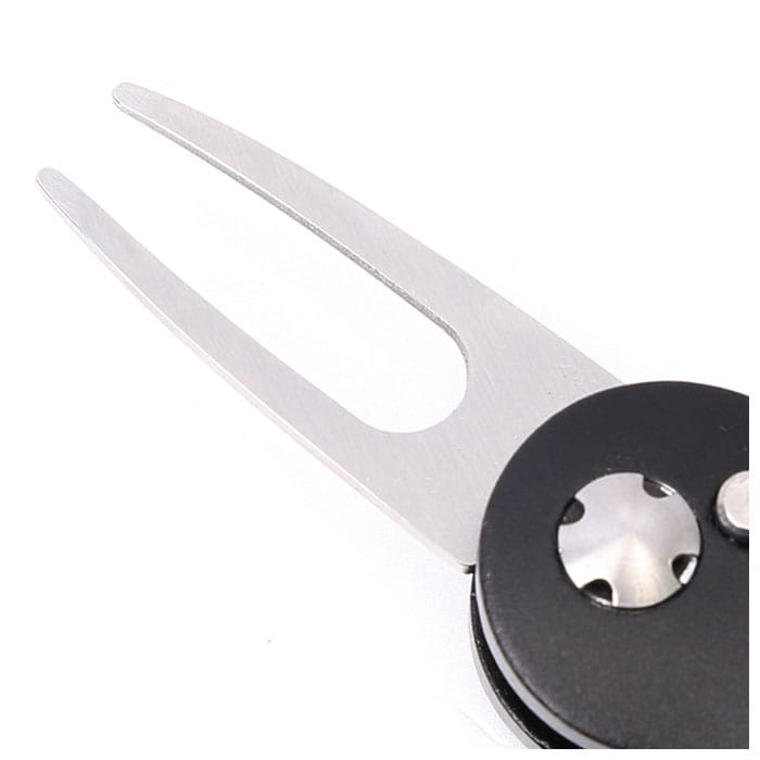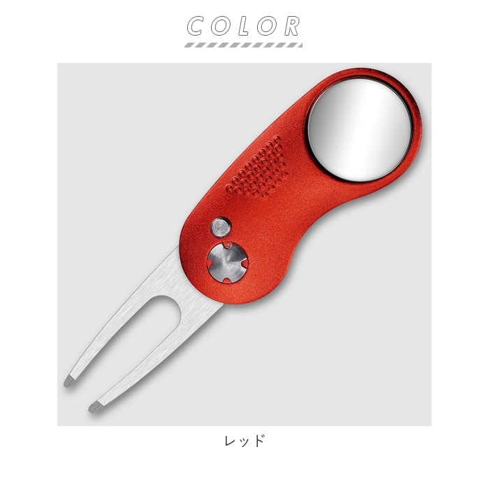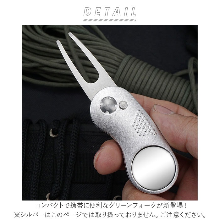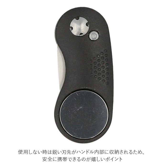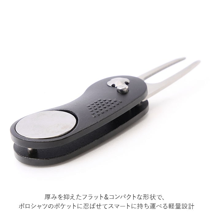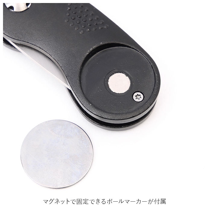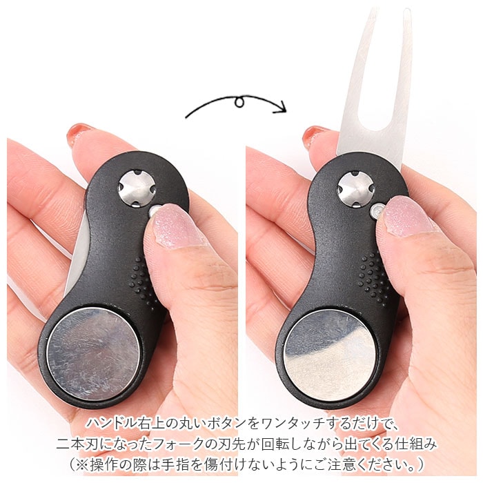 | 商品説明 | グリーンでプレイする時のエチケット!コンパクトで携帯に便利なグリーンフォークが新登場!グリーンにボールが落下した時にできてしまうピッチマーク(グリーンの凹み)をサッと修復することのできる便利グッズ。ハンドル右上の丸いボタンをワンタッチするだけで、二本刃になったフォークの刃先が回転しながら出てくる仕組み。(※勢いよく刃先が出てくるので、操作の際は手指を傷付けないようにご注意ください。)使用しない時は鋭い刃先がハンドル内部に収納されるため、安全に携帯できるのが嬉しいポイント。厚みを抑えたフラット&コンパクトな形状で、ポロシャツのポケットに忍ばせてスマートに持ち運べる軽量設計。後でコースを使用する人が気持ちよくプレイできるように、グリーンを修復するのがゴルファーのマナー。オシャレに携帯できるメタリック調ボディもGood!マグネットで固定できるボールマーカーが付属。 |