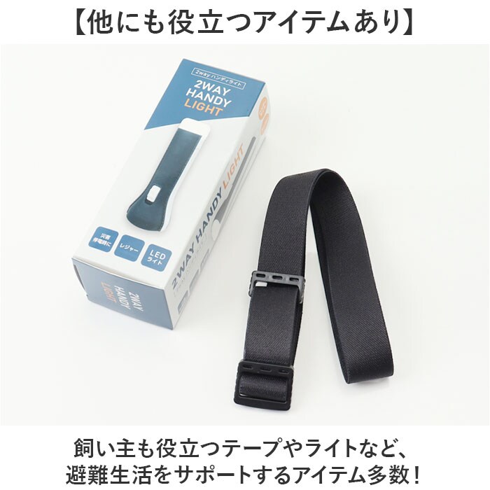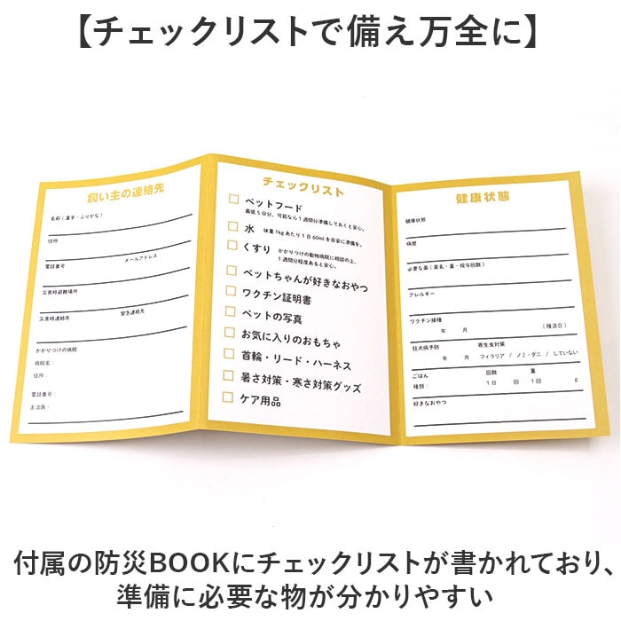 | 商品説明 | 【愛犬のもしもの備えに】いざッというときにパッと持ち出せる!ペット防災18点セットが新登場。【万が一の時に】災害などによるワンちゃんと避難時に役立つキャリーを含んだ小物18点セット。【キャリーにもなるトートバッグ】専用のトートバッグはキャリーケースと兼ねた作り。2層に分かれており下には小物をIN【両サイドはメッシュ素材】通気性が良く、ワンちゃんが息苦しくならないよう両サイドはメッシュ素材に。【リュックとしての機能も】トートバッグの背面にはショルダーを搭載。リュックみたいに背負ったり前に抱えてもOK!【キャリーのみでも使える】下部の収納は未使用時スナップボタンで畳むことも可能!キャリー機能のみの使用も可能。【衛生的に使えるケア用品】ペットシーツはもちろん、専用のウエットティッシュや綿棒などケア用品も充実♪【寒さ対策のブランケット】起毛素材のブランケットは肌寒い日や冷房対策にピッタリ☆【餌や水入れに】折り畳めるシリコーンボウルは餌や水入れに。使用後はサッと洗うだけで汚れが落ちる。【ワンちゃんの迷子対策に】リードや迷子札が付いており、避難中や移動時の迷子対策もばっちり。【他にも役立つアイテムあり】飼い主も役立つテープやライトなど、避難生活をサポートするアイテム多数!【チェックリストで備え万全に】付属の防災BOOKにチェックリストが書かれており、準備に必要な物が分かりやすい【ワンちゃんのプロフィールを】さらにワンちゃんの健康状態や飼い主の情報を書く欄付き。【使わないときはコンパクトに】トートバッグはコンパクトに畳めるので、未使用時の収納場所に困らない♪ |