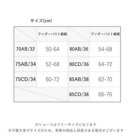 | サイズ | 【ブラジャー】 ・70A/70B(US32)サイズ ・75A/75B(US34)サイズ ・75C/75D(US34)サイズ ・80A/80B(US36)サイズ ・80C/80D(US36)サイズ ・85A/80B(US38)サイズ ・85C/80D(US38)サイズ ※詳しくはサイズ表をご覧ください。 【ショーツ】フリーサイズ |