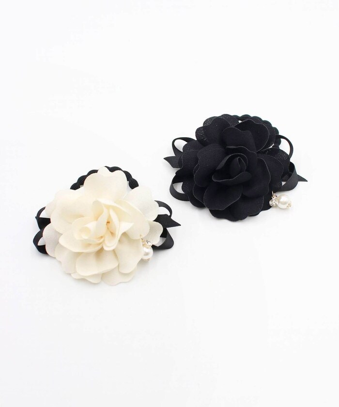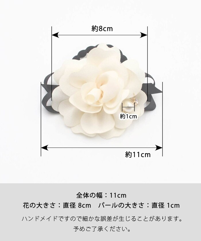 | サイズ | 全体の幅:11cm 花の大きさ:直径8cm パールの大きさ:直径1cm (ハンドメイドですので細かな誤差が生じることがあります。 予めご了承ください。) |