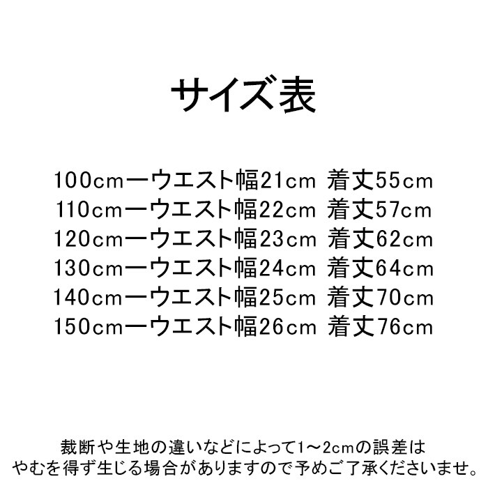 | サイズ | 100cmーウエスト幅21cm着丈55cm 110cmーウエスト幅22cm着丈57cm 120cmーウエスト幅23cm着丈62cm 130cmーウエスト幅24cm着丈64cm 140cmーウエスト幅25cm着丈70cm 150cmーウエスト幅26cm着丈76cm |