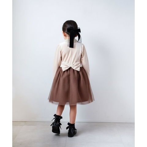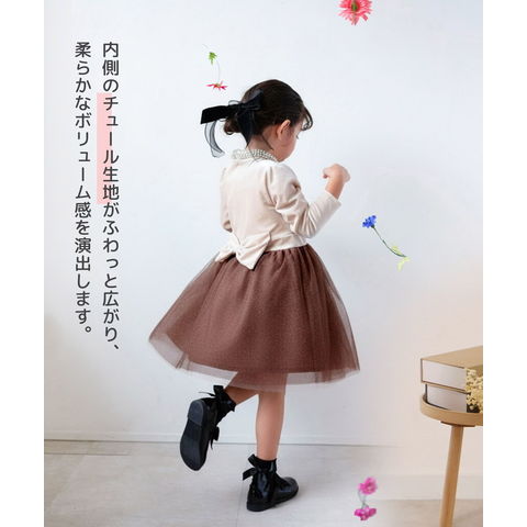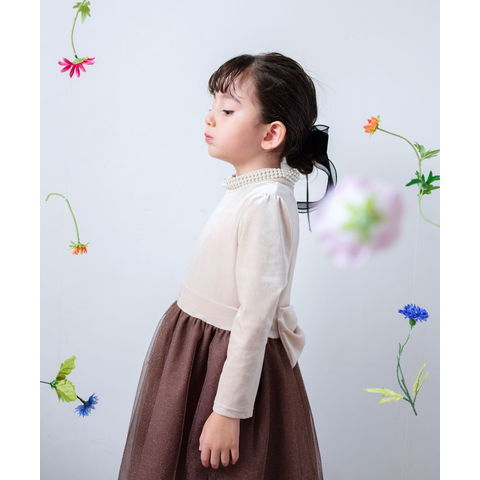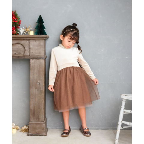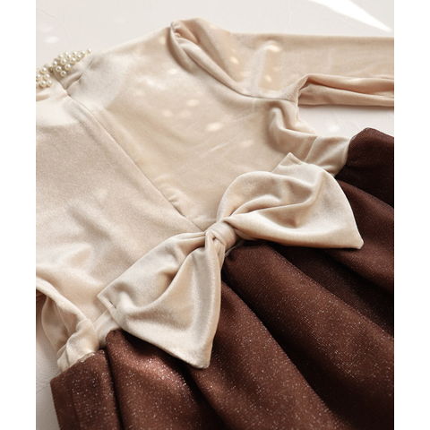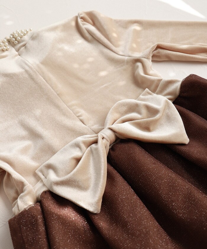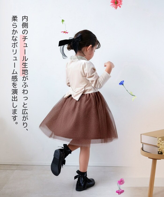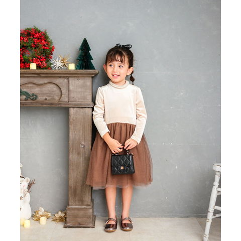 | 商品説明 | 特別な日にぴったりな華やかさを纏ったベロアのドッキングドレスが登場。柔らかなベロア素材で作られたトップ部分は、肌触りが良く、上品な光沢感が魅力。首元にはパールのデザインが施され、シンプルながらも華やかさを引き立てます。スカート部分は、ラメ入りのチュール生地が使われ、動くたびに輝きが感じられるデザイン。内側のチュール生地がふわっと広がり、柔らかなボリューム感を演出します。裏側の布帛素材も丁寧に仕立てられ、着心地も抜群です。フォーマルなイベントやお祝い事にぴったりな、可愛らしくもエレガントなアイテムです。 |